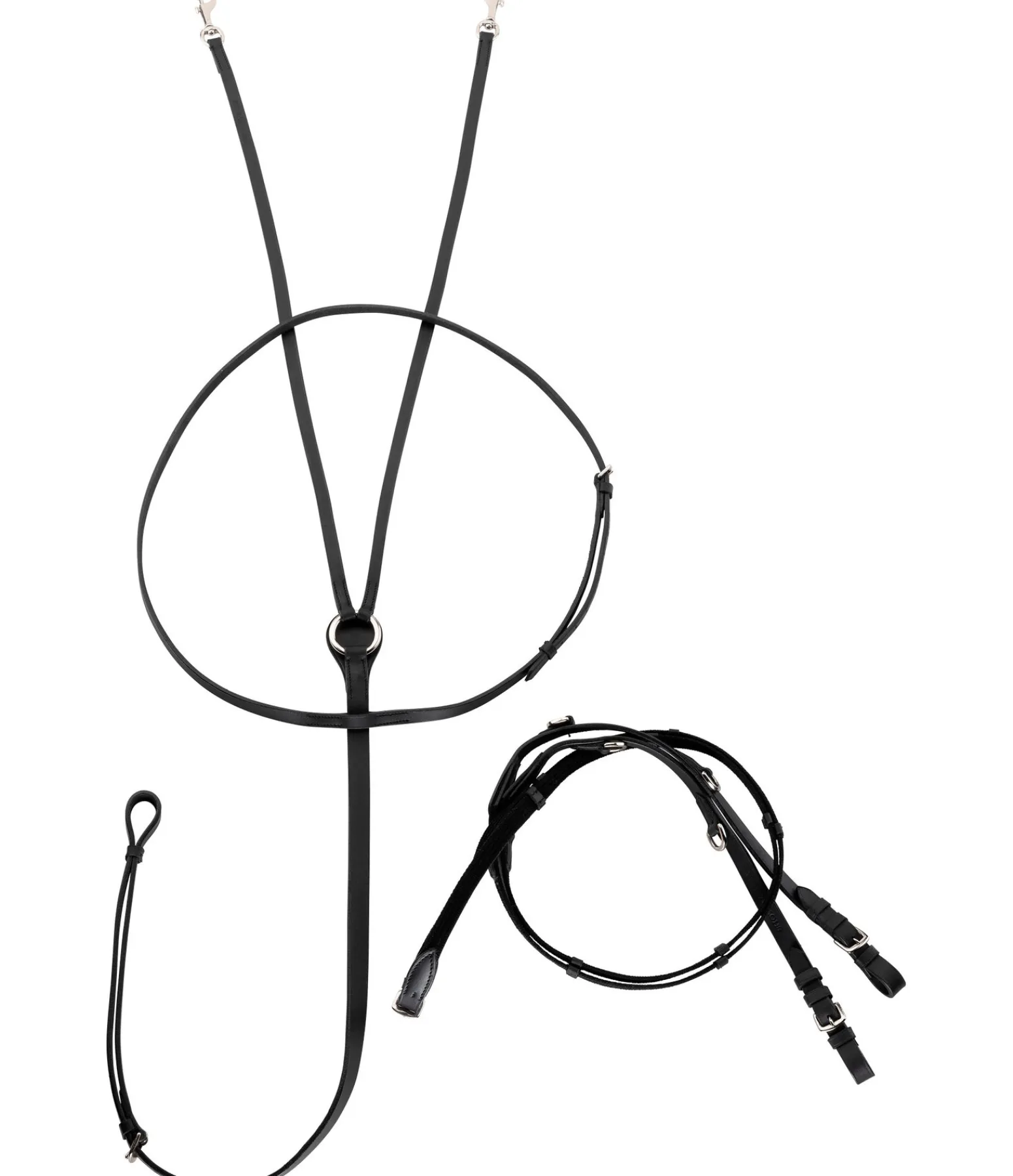 Combinaison de martingale en cuir avec fourche allongée et mousquetons aux extrémités avec rênes dotés de 3 anneaux semi-circulaires fixes permettant différents réglages. Empêche le cheval de lever trop la tête, sans toutefois limiter sa liberté de mouvement, car le cavalier peut lâcher les rênes à sa guise et n’est pas limité par des rênes fixes. En cuir véritable.