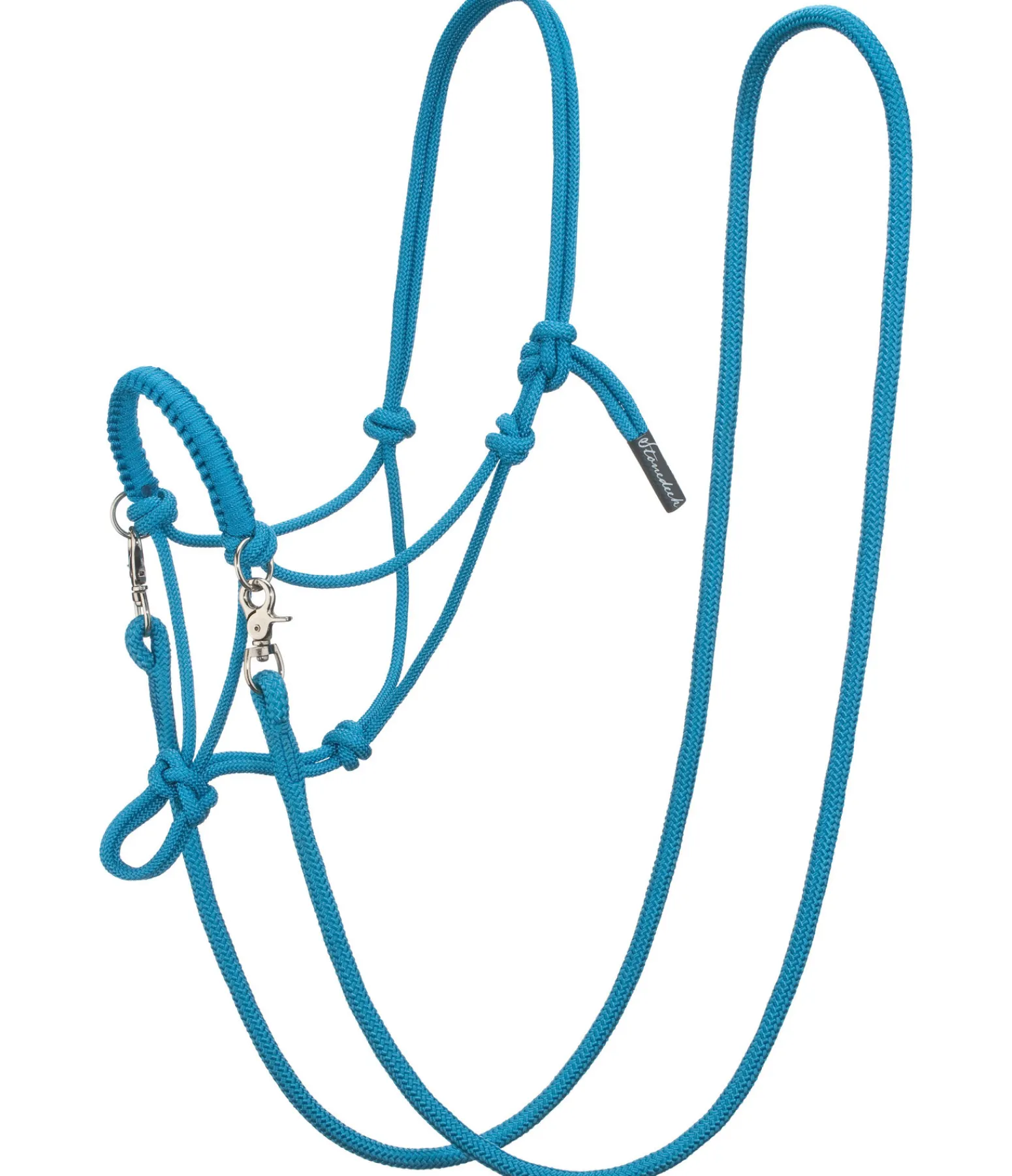 Licol à noeuds haut de gamme. Pour le travail au sol ou monté. En matière souple et résistante. Avec anneaux pour les rênes et muserolle tressée. Épaisseur de la corde 8 mm. Livré avec rênes à mousquetons et longe assorties. Longueur des rênes, mousquetons compris 2,6 m, épaisseur des rênes et de la longe 16 mm. Longueur de la longe 2,4 m.