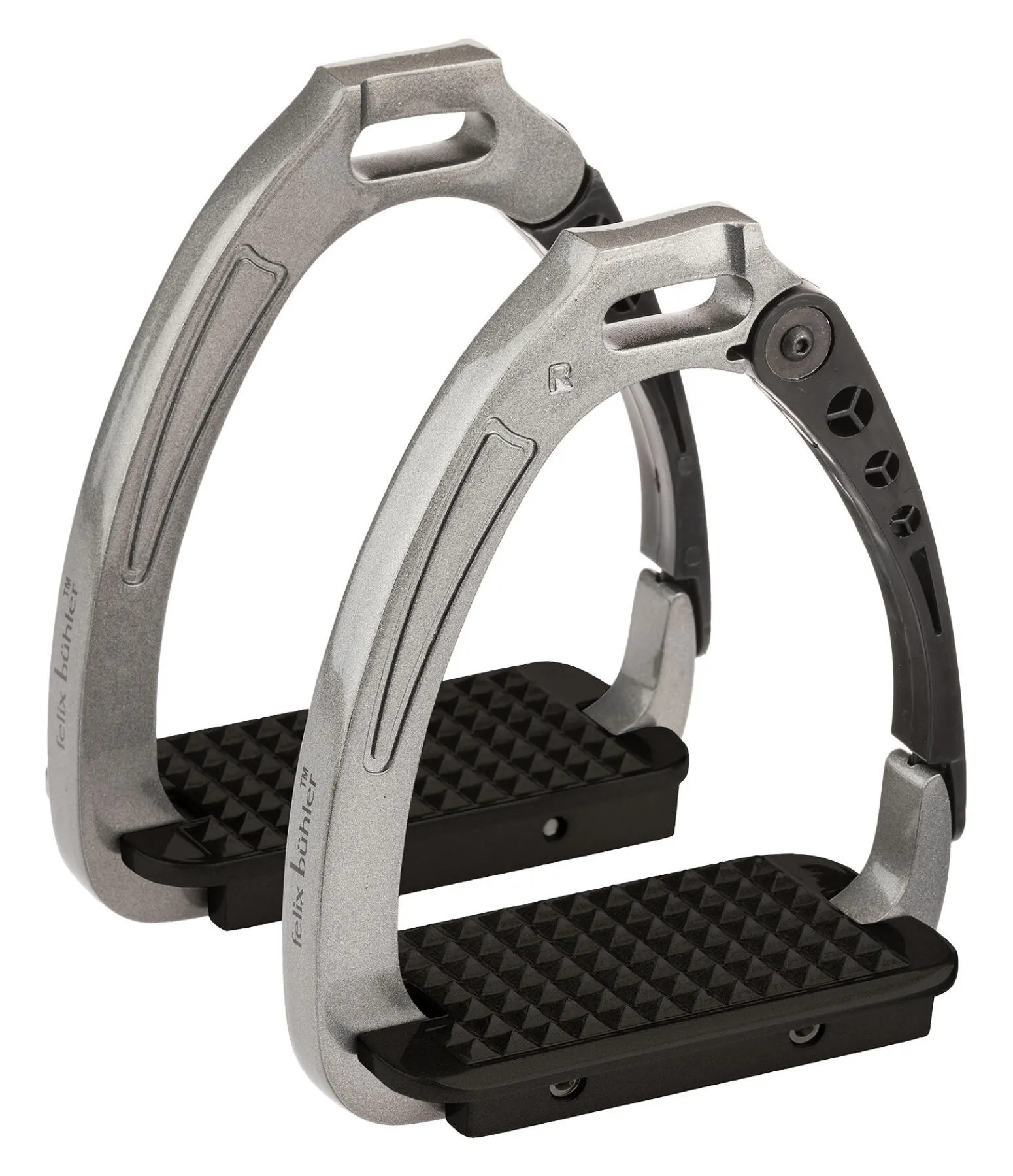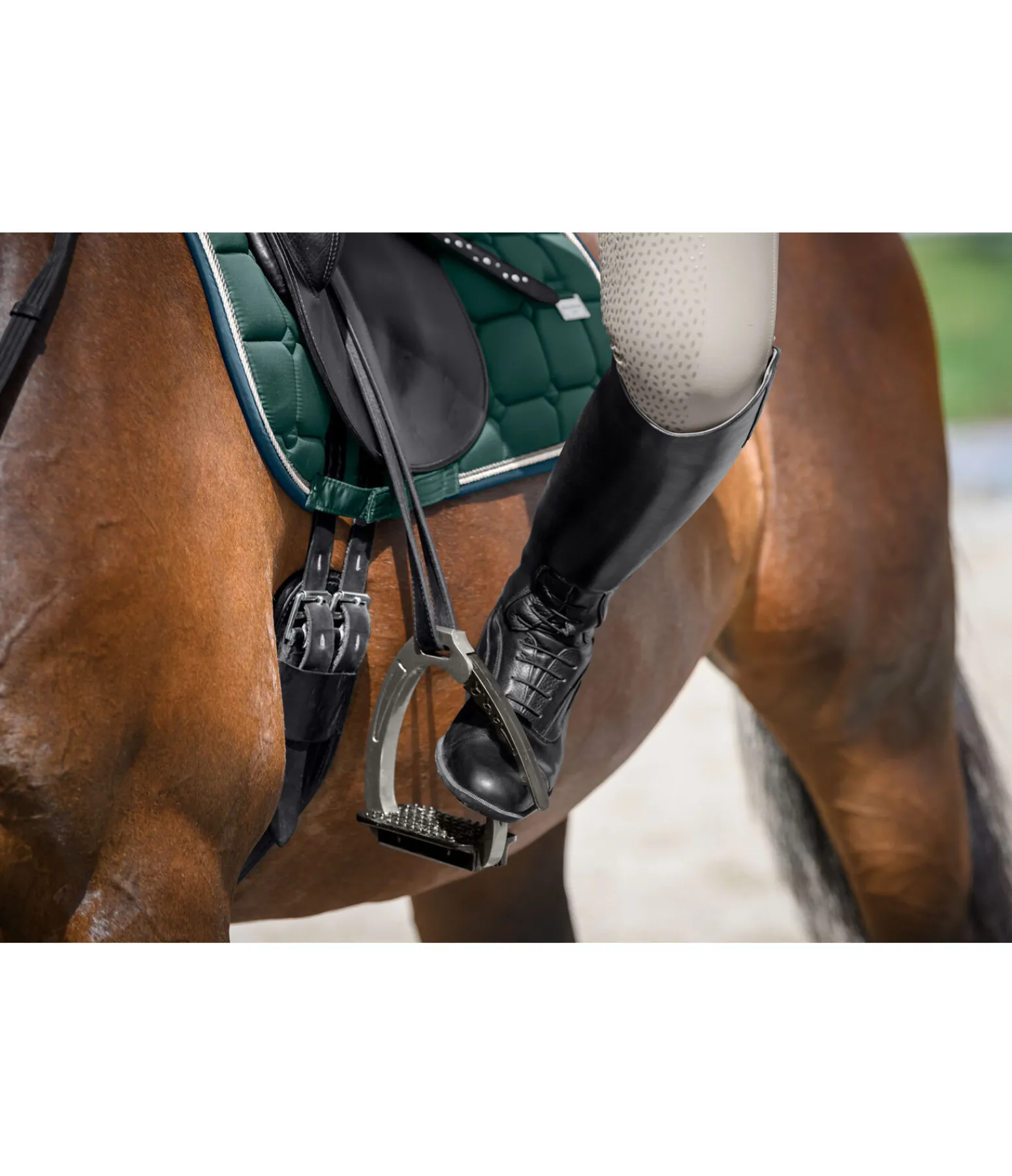 Étriers de sécurité en aluminium de qualité supérieure. Avec charnière mobile sur l’extérieur qui dégage le pied en cas de chute en s’ouvrant automatiquement avec le poids du cavalier. Assurent stabilité et bon maintien grâce à un plancher large de 6,5 cm. Vendus par paire.