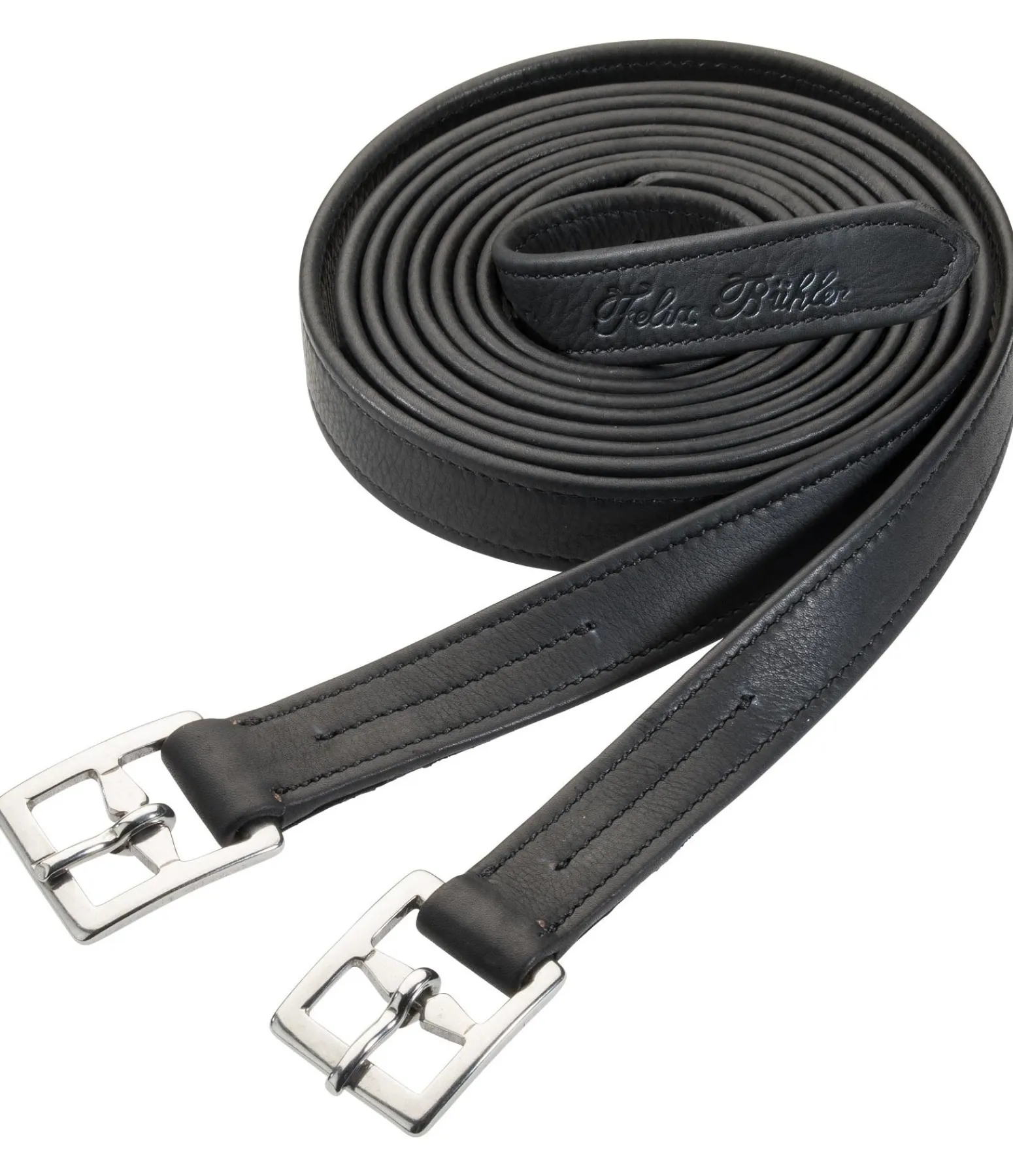 Étrivières de grande qualité en cuir de veau souple ciré. Extrêmement résistantes à la déchirure grâce à une coeur en nylon. Boucles argentées en acier inoxydable légèrement incurvées. Largeur 2,5 cm. Vendues par paire.