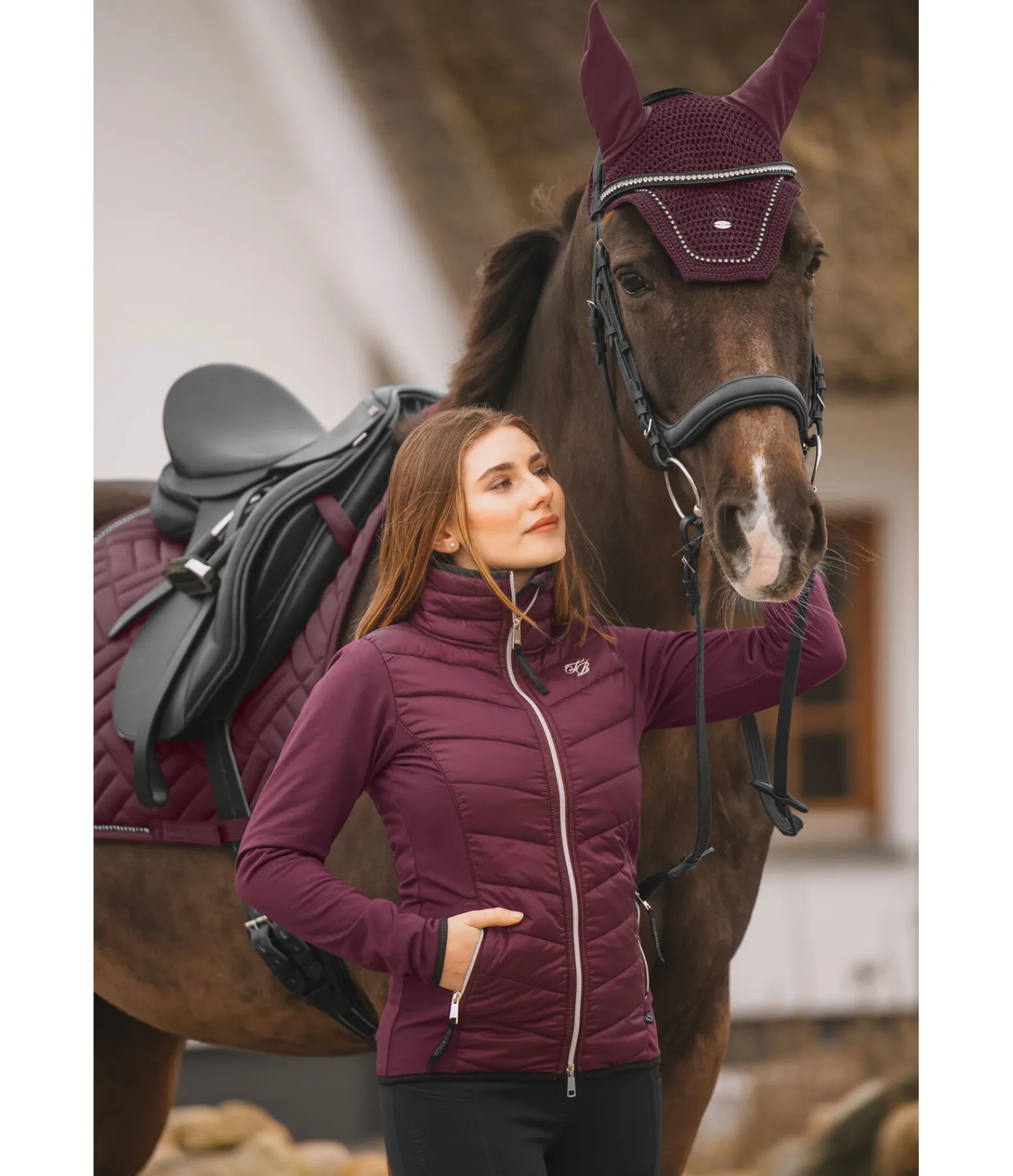 Élégant bonnet anti-mouches avec strass. Petit médaillon discret avec logo gravé. Matière extensible aux oreilles. Deux pattes auto-agrippantes permettant de fixer le bonnet à la têtière du bridon. Bonnet 100 % polyester, matière extensible 97 % polyester, 3 % élasthanne.
