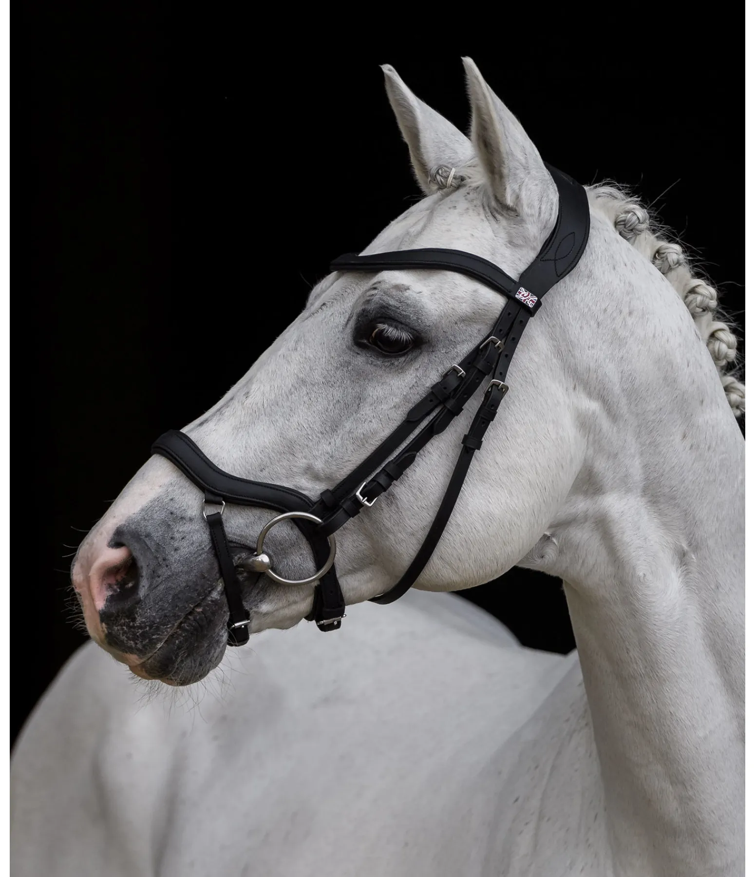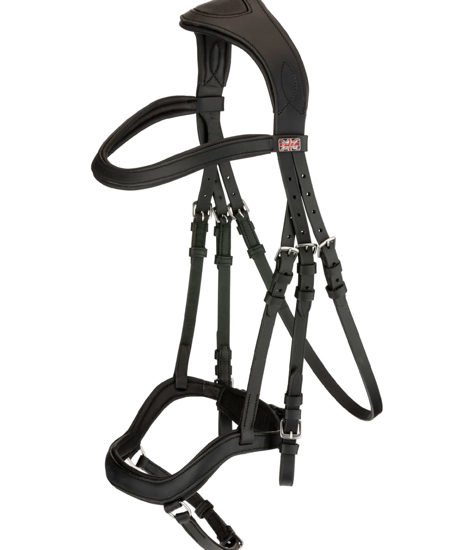 Bridon confortable en cuir gras souple. Muserolle combinant les effets d’une muserolle française et d’une muserolle allemande. Les anneaux de fixation latéraux du noseband permettent d’éviter les pressions sur l’os du nez, facilitent la fermeture et offrent davantage de liberté aux naseaux. Têtière anatomique extra-large, muserolle, pad de menton et frontal avec doublure extra-moelleuse en cuir véritable. Cuir gras. Bouclerie argentée. Sans rênes, sans mors.