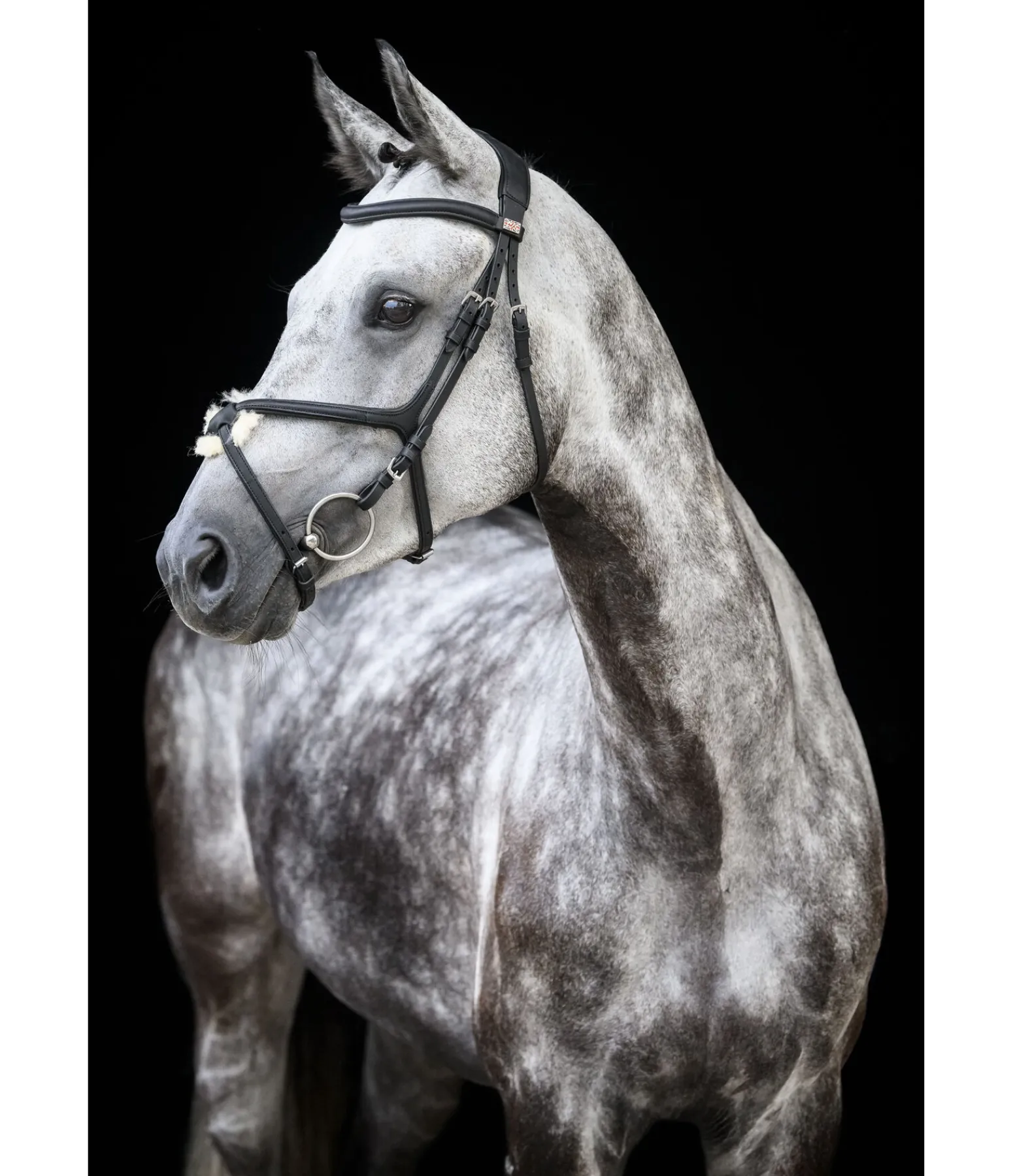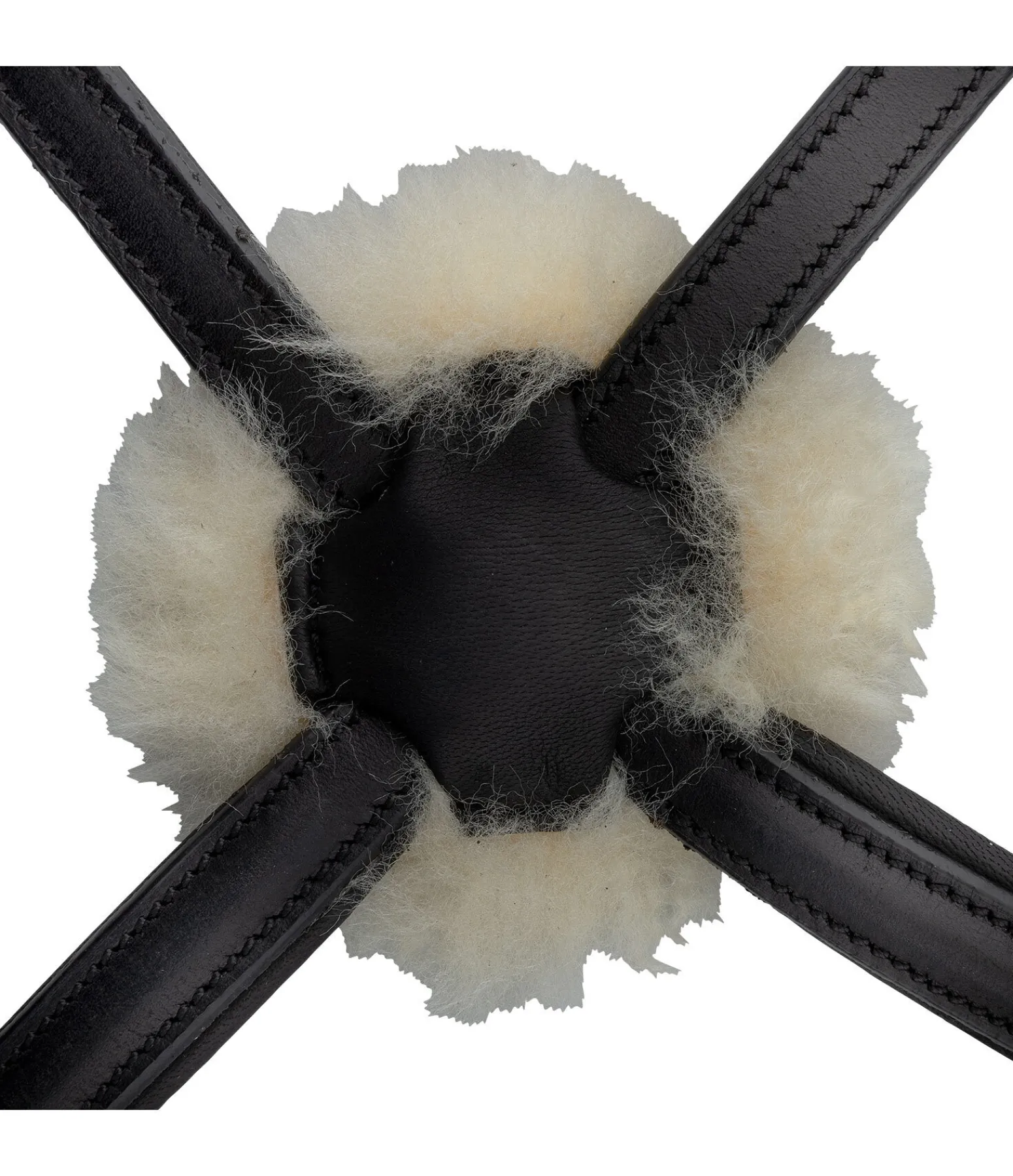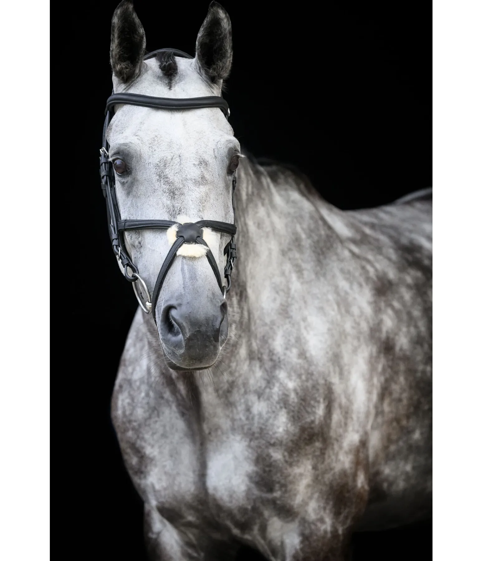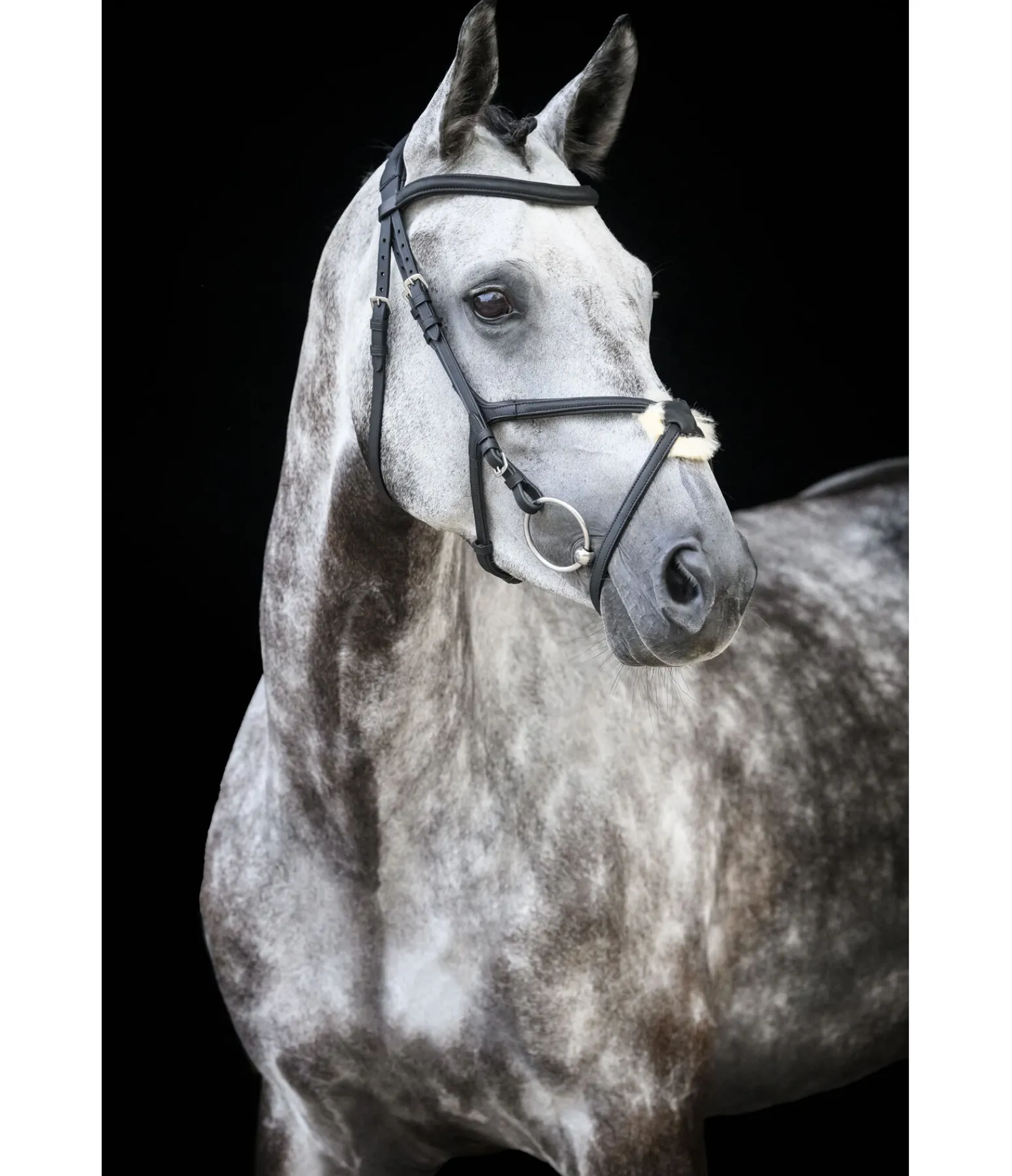Bridon en cuir avec muserolle croisée avec bases triangulaires sans anneaux gênants. Frontal vague et point de croisement central en cuir souple travaillé, particulièrement agréable et flexible. Têtière anatomique extra-large. Tous les éléments en cuir sont en cuir gras très souple huilé plusieurs fois. Point de croisement doublé en fourrure d’agneau, ce qui le rend idéal pour les chevaux à la tête sensible. Bouclerie argentée. Sans rênes ni mors.