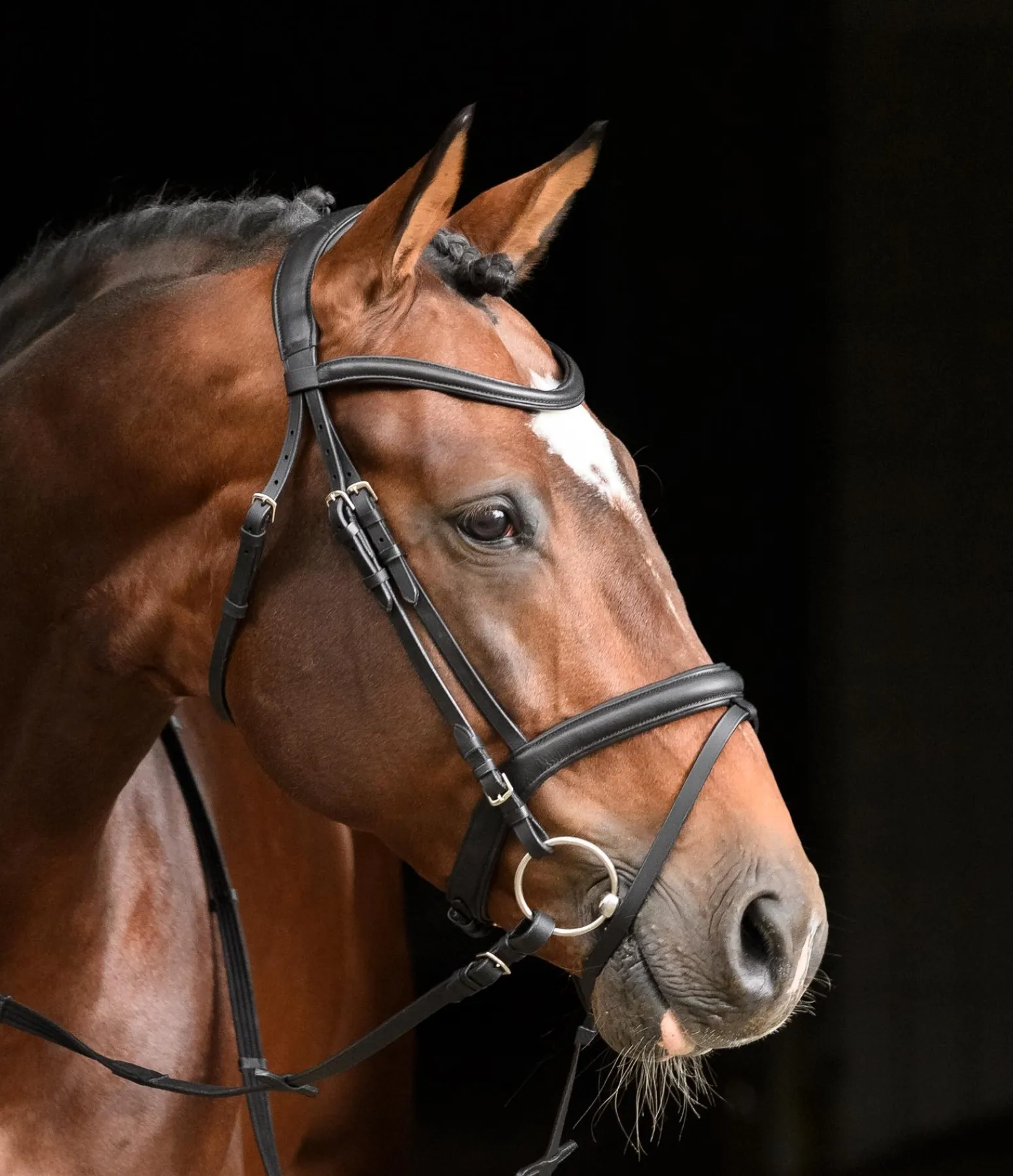 Bridon de premier choix en cuir sophistiqué particulièrement doux et souple. Têtière anatomique large avec découpe aux oreilles et large appui sur la nuque garantissant une répartition optimale des pressions. Frontal vague, muserolle et têtière équipées d’un rembourrage doux. Bridon noir avec bouclerie argentée, bridon brun avec bouclerie dorée. Avec rênes sangle, sans mors. Consulter le règlement en vigueur auprès de la FFE et FEI avant toute épreuve de compétition.