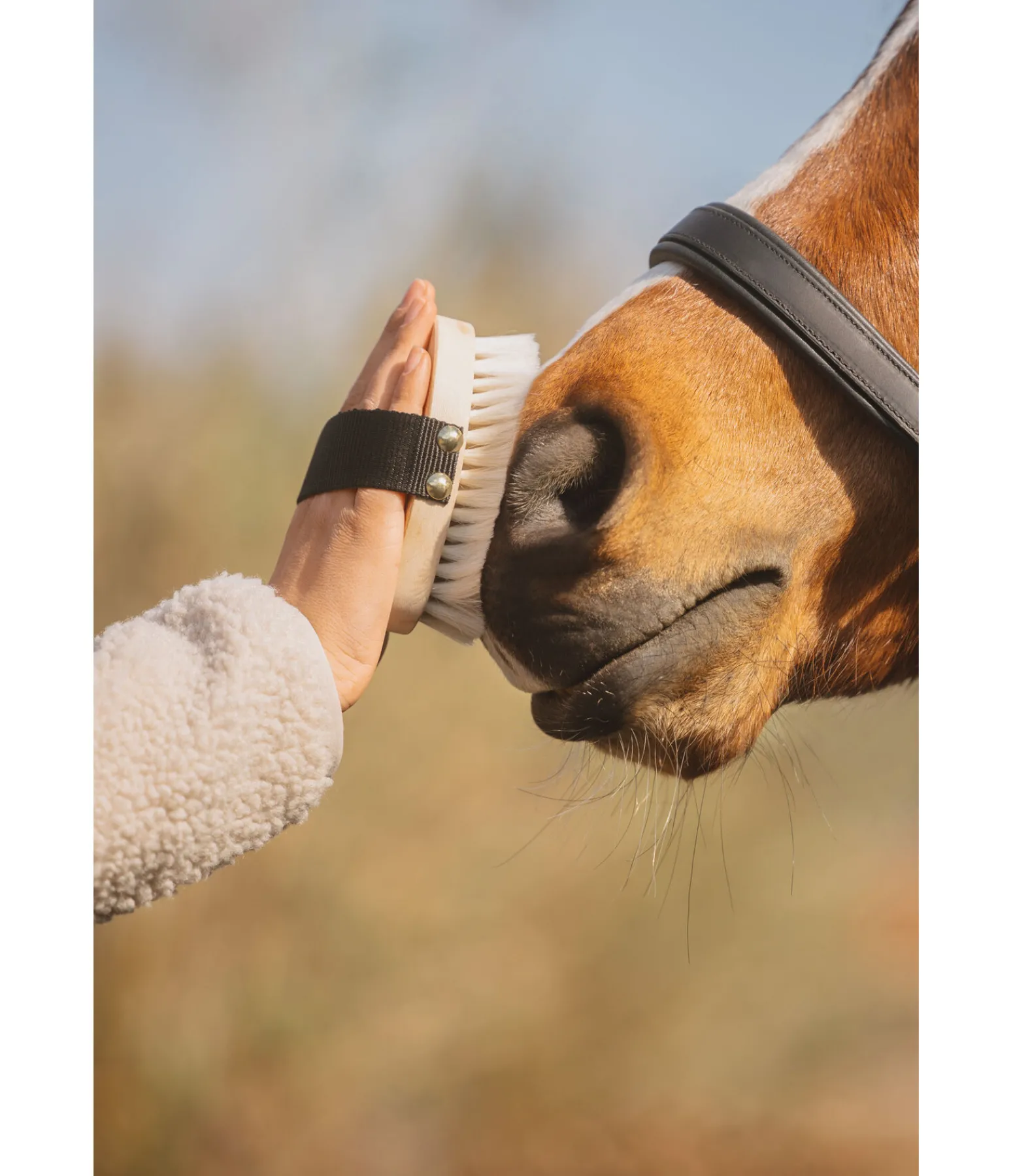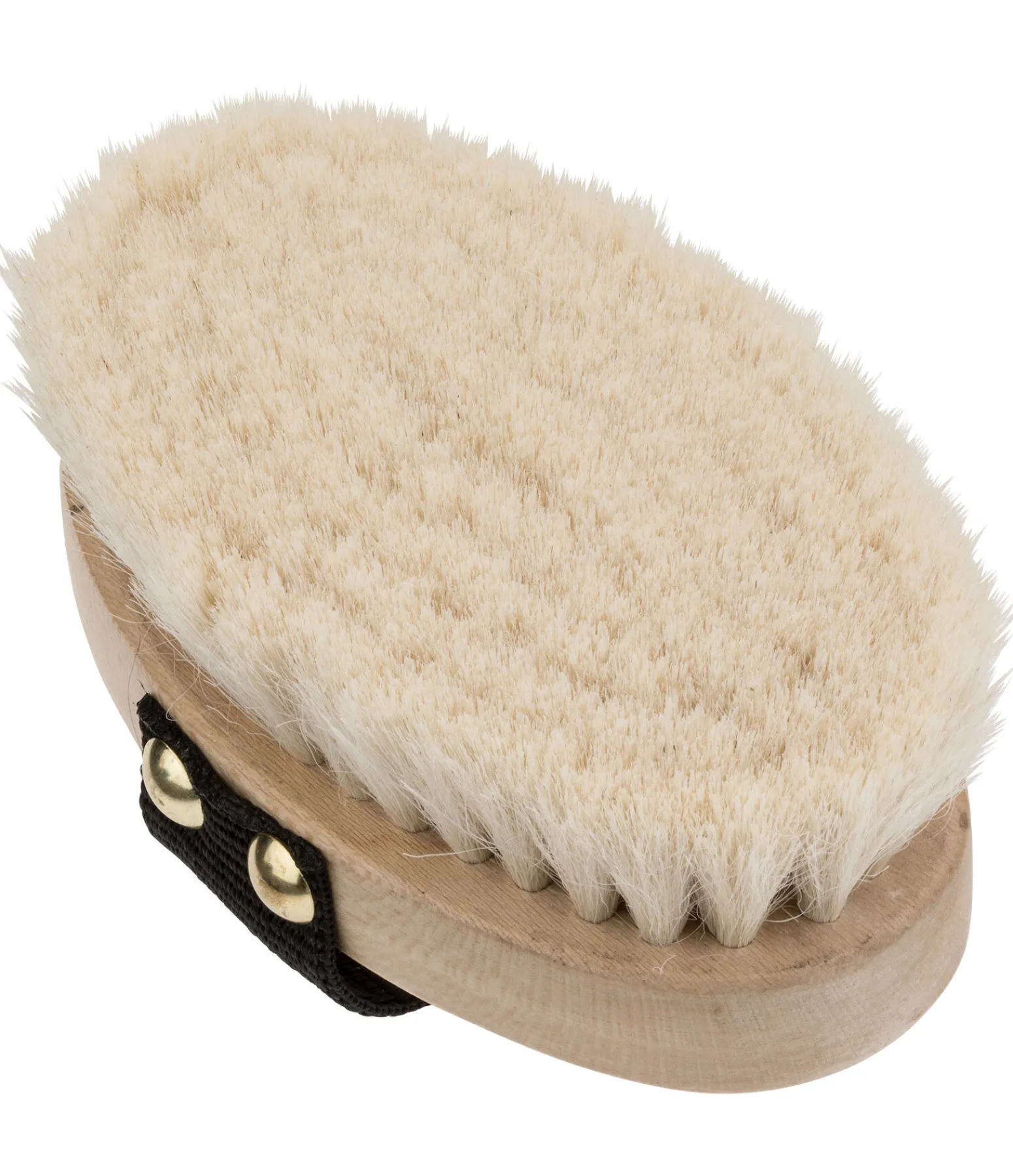 Brosse extra-douce en véritables poils de chèvre. Idéale pour la tête et pour la brillance finale. Dos de la brosse en bois. 12,5 x 7 cm.