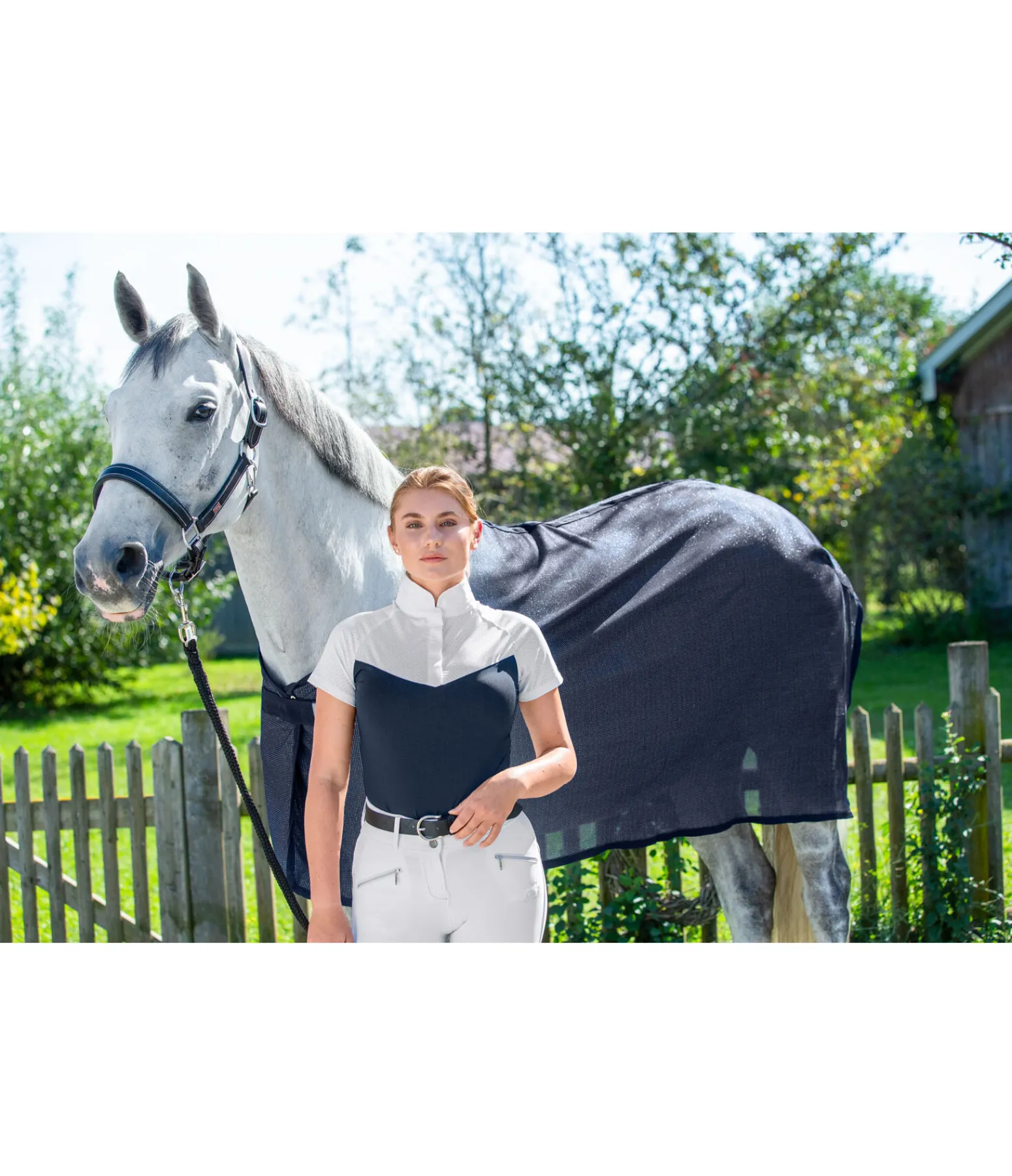 La chemise anti-mouches peut aussi être élégante ! Couverture simple avec fermeture de poitrail simple dissimulée à crochet en T. Idéale pour être utilisée en compétition, au quotidien à l’écurie comme chemise séchante, après l’entraînement, pour le broutage, les promenades ou chez le maréchal-ferrant. Filet en maille fine avec fil intégré scintillant au soleil. Doublure lisse protégeant la robe et les crins au niveau des épaules. Cordon de queue.100 % polyester.