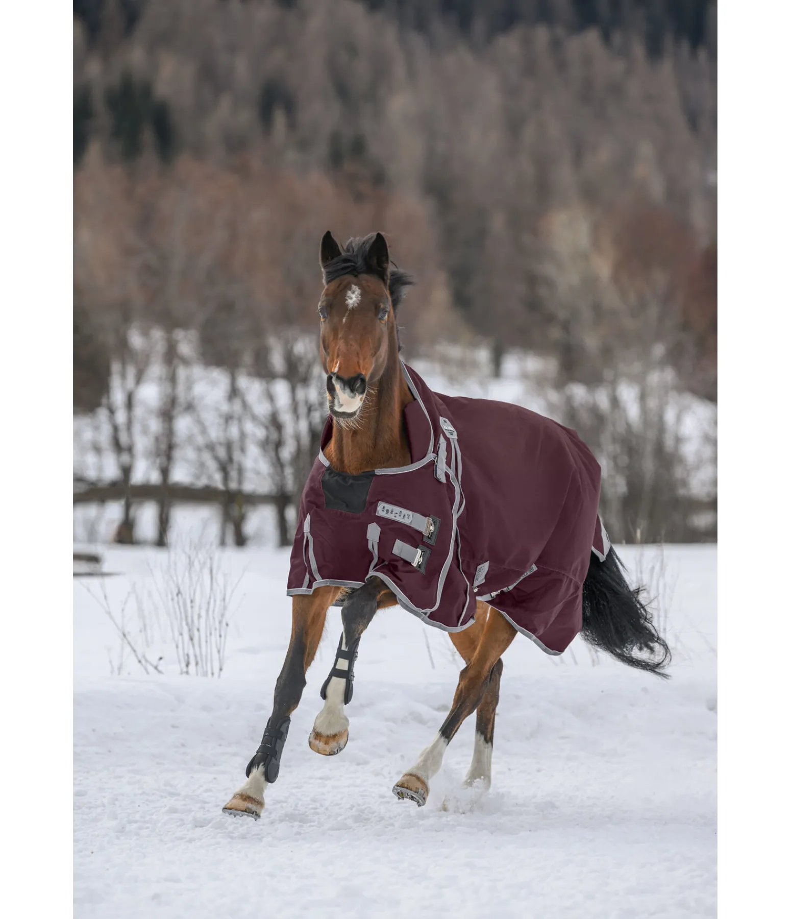 Couverture d’extérieur innovante particulièrement résistante à la déchirure en matériau de 1.200 deniers, imperméable (5.000 mm). Léger garnissage. Fermeture avec rabat latéral en trois points grâce aux crochets en T et patte auto-agrippante supplémentaire. La zone du poitrail est ainsi exempte de boucles et de crochets à l´avant, ce qui est un plus en matière de sécurité. Par exemple, la couverture ne peut pas se prendre dans les mailles du filet à foin. Rembourrage au garrot et double plis d’aisance au niveau des épaules et à l’avant pour une plus grande liberté de mouvement. Insert confortable en Softshell extensible et déperlant à l’avant, qui évite les frottements et permet de baisser la tête sans être gêné. Zone des épaules rembourrée permettant une répartition optimale des points de pression et évitant les irritations dues aux frottements. Passepoil réfléchissant sur tout le pourtour et rabat de queue avec bandes réfléchissantes. Doublure intérieure lisse et agréable pour la robe. Sursangles croisées et courroie de queue réglable en longueur. 100 % polyester