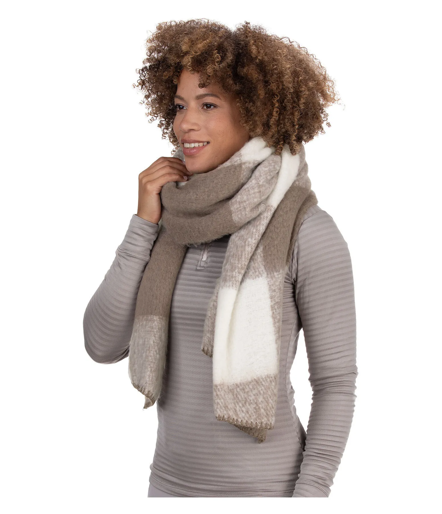 Écharpe asymétrique à grands carreaux bicolores. Environ 190 x 55 cm. 90 % polyester, 10 % laine.