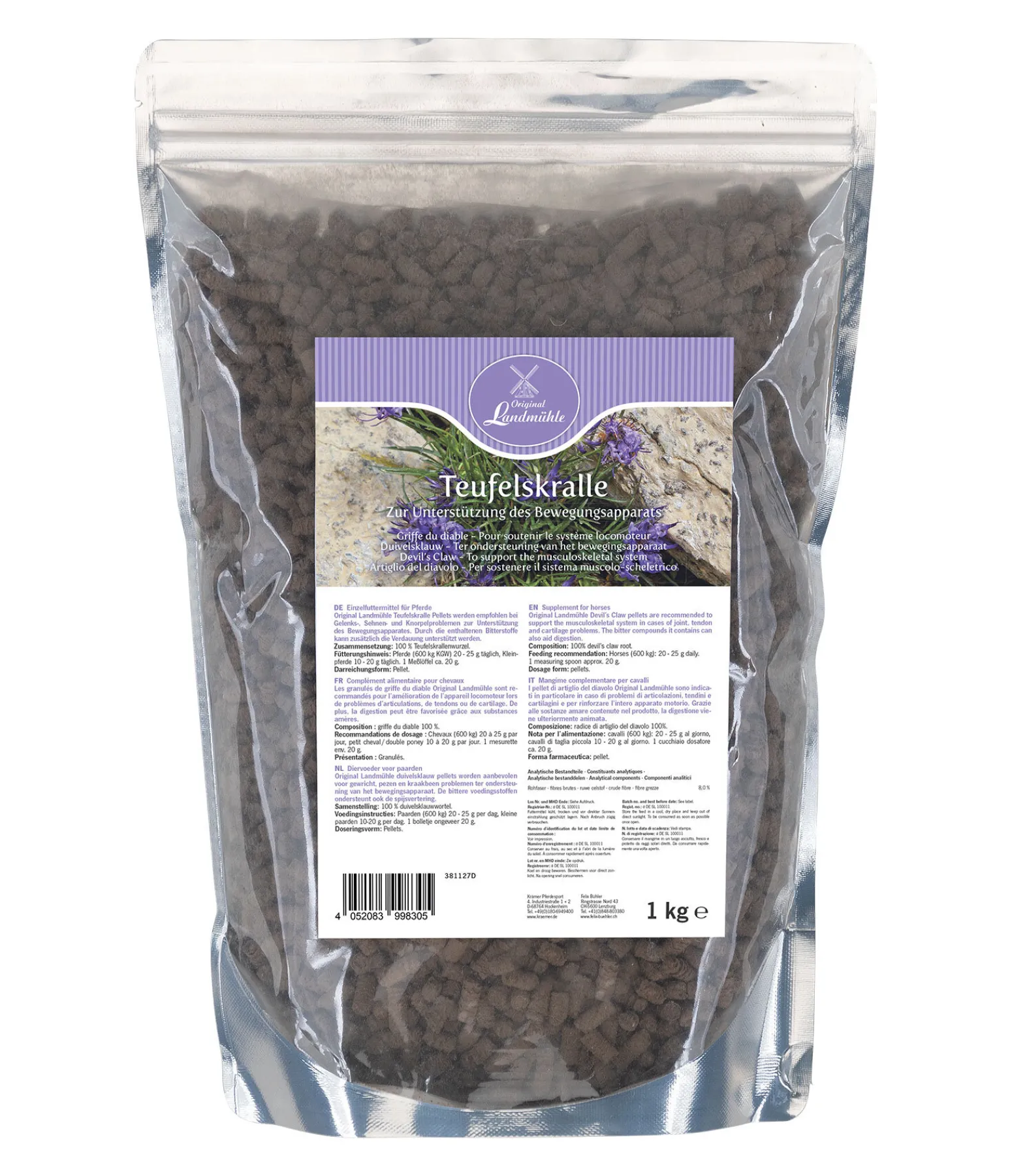 Recommandations de dosage : cheval (600 kg) 20 à 25 g par jour, 1 mesure = env. 20 g.