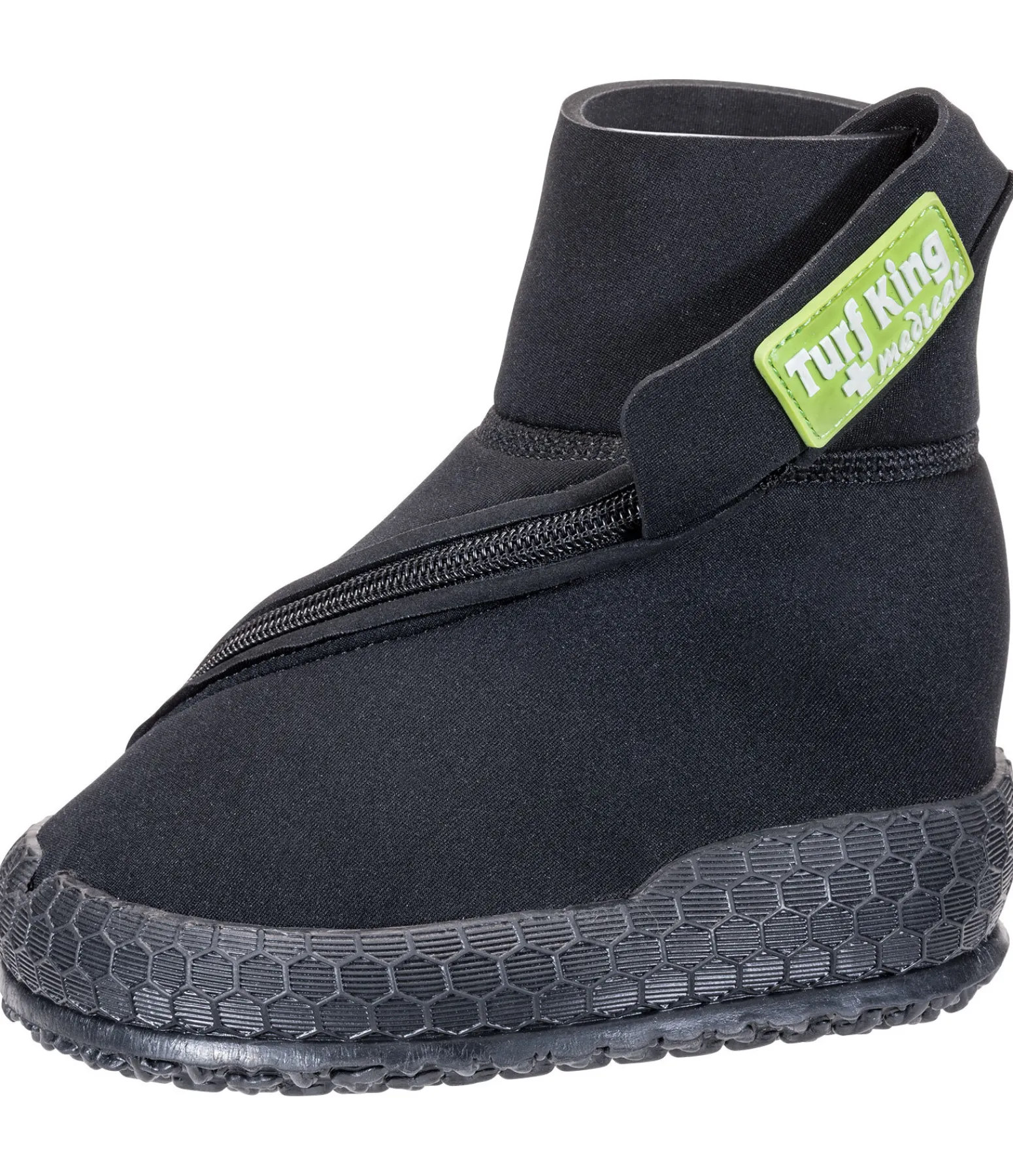 Hipposandale vétérinaire. Pour une protection optimale des pansements. À porter à l’écurie. La semelle extérieure crantée robuste offre une bonne adhérence et, associée au matériau résistant à l’abrasion à l’intérieur de le semelle, garantit une longue durée de vie. Peut être portée avec ou sans fer à cheval. Dessus en caoutchouc chloroprène souple. Fermeture à glissière transversale pour faciliter le chaussage sur le sabot. Lavable en machine à 30°C.