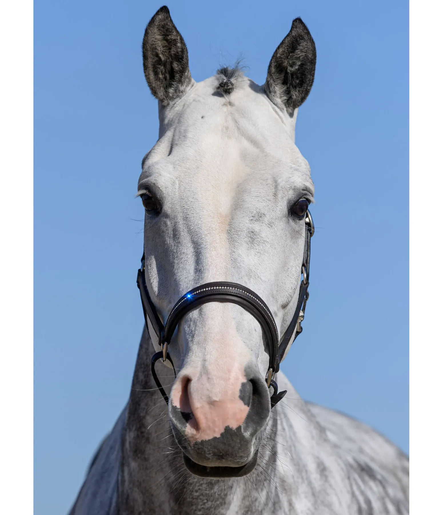 Licol en cuir gras orné d’une rangée de petits strass blancs discrets sur la muserolle. Doublure moelleuse en cuir véritable à la muserolle et la têtière pour un confort optimal. Têtière et muserolle facilement réglables. Bouclerie argentée.