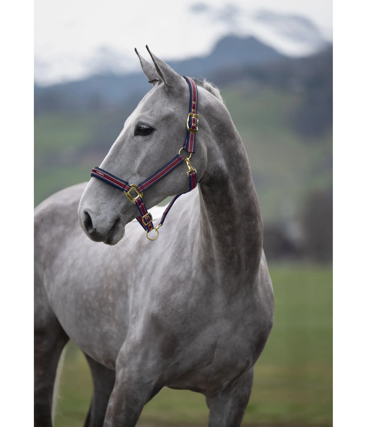 Licol rayé dans un look sportif avec élégante bande cousue sur la muserolle. Doublure douce en caoutchouc chloroprène sur la têtière, la muserolle et les montants. Têtière et muserolle réglables. Licol 100 % polypropylène.