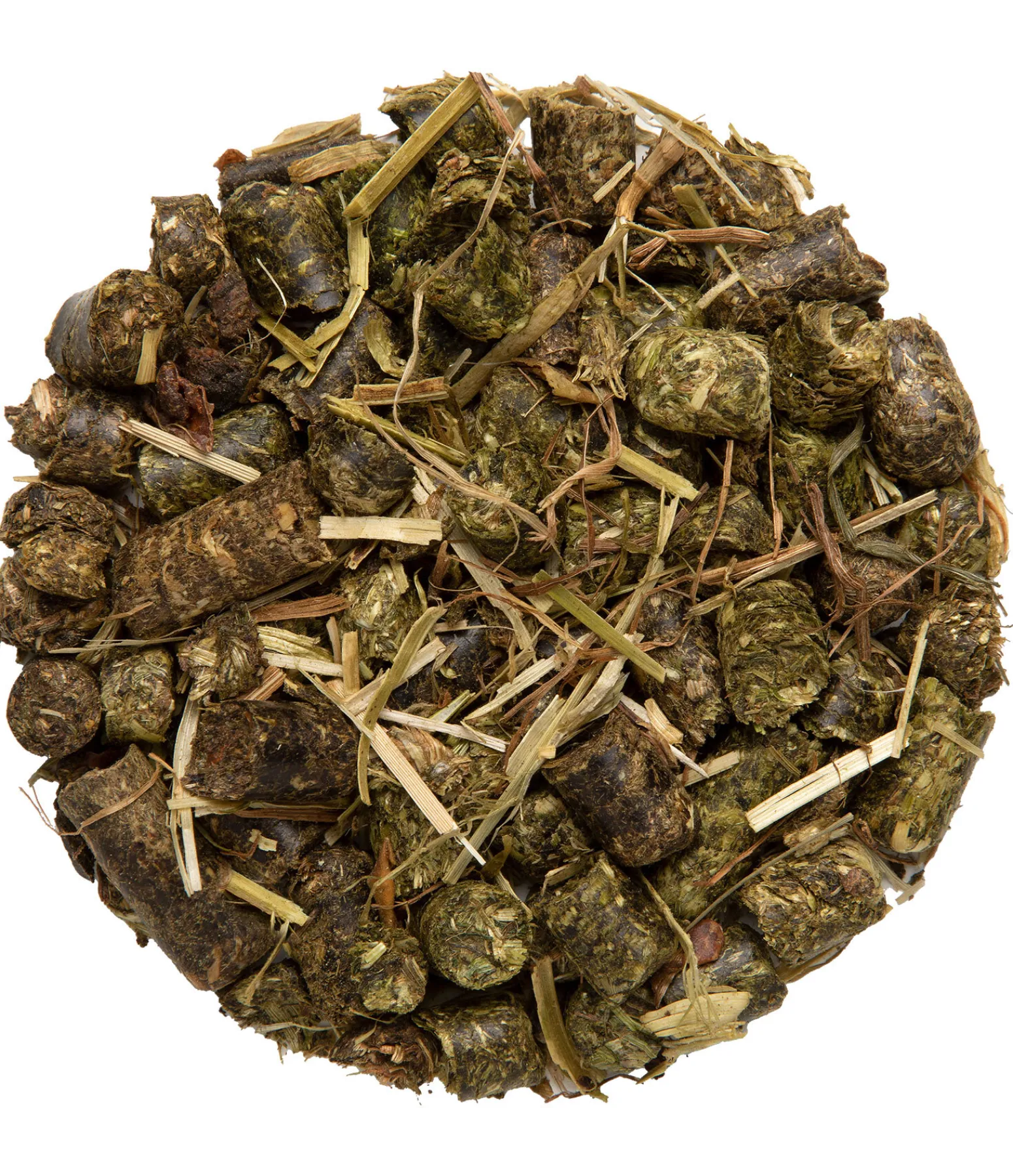 Composition : Herbes et plantes de prairies (séchées à l’air chaud, broyées et compressées en granulés), marc de pomme, huile alimentaire, carbonate de calcium, monophosphate de calcium, chlorure de sodium, oxyde de magnésium.