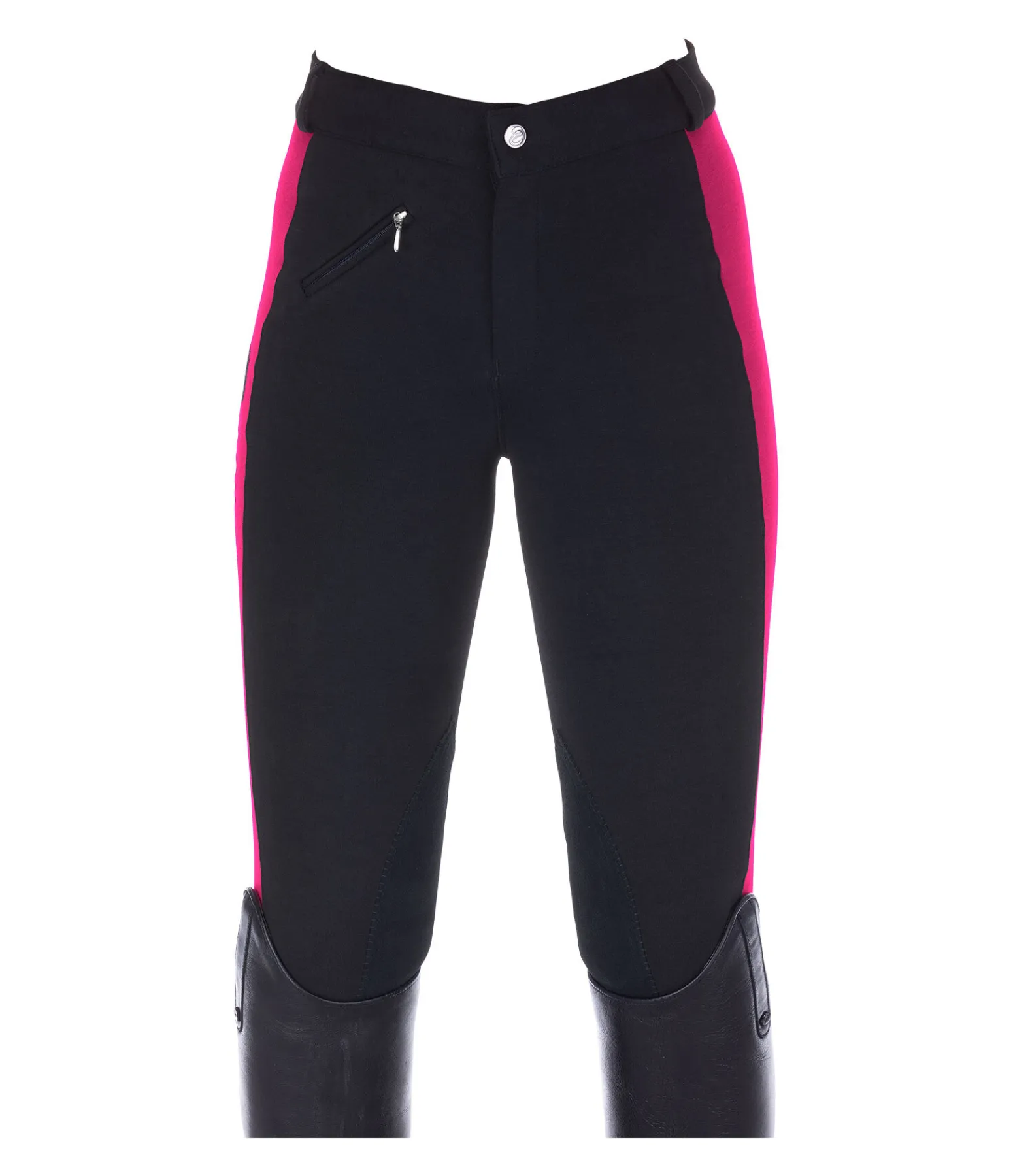 Pantalon d’équitation bicolore à basanes. Broderie de couleur contrastante sur la cuisse. 92 % coton, 8 % élasthanne.