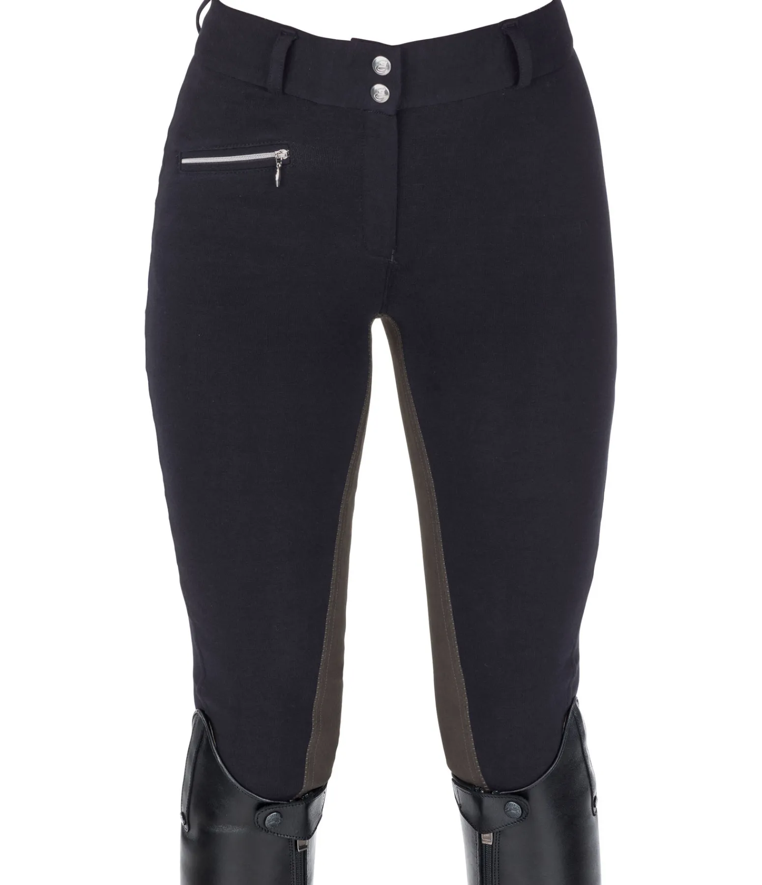 Pantalon d’équitation basique avec fond intégral en synthétique. Matière très extensible et extrêmement douce. 1 poche zippée avant. Large ceinture élastiquée avec 2 boutons. Bas de jambe extensible, sans patte auto-agrippante. 95 % coton, 5 % élasthanne.