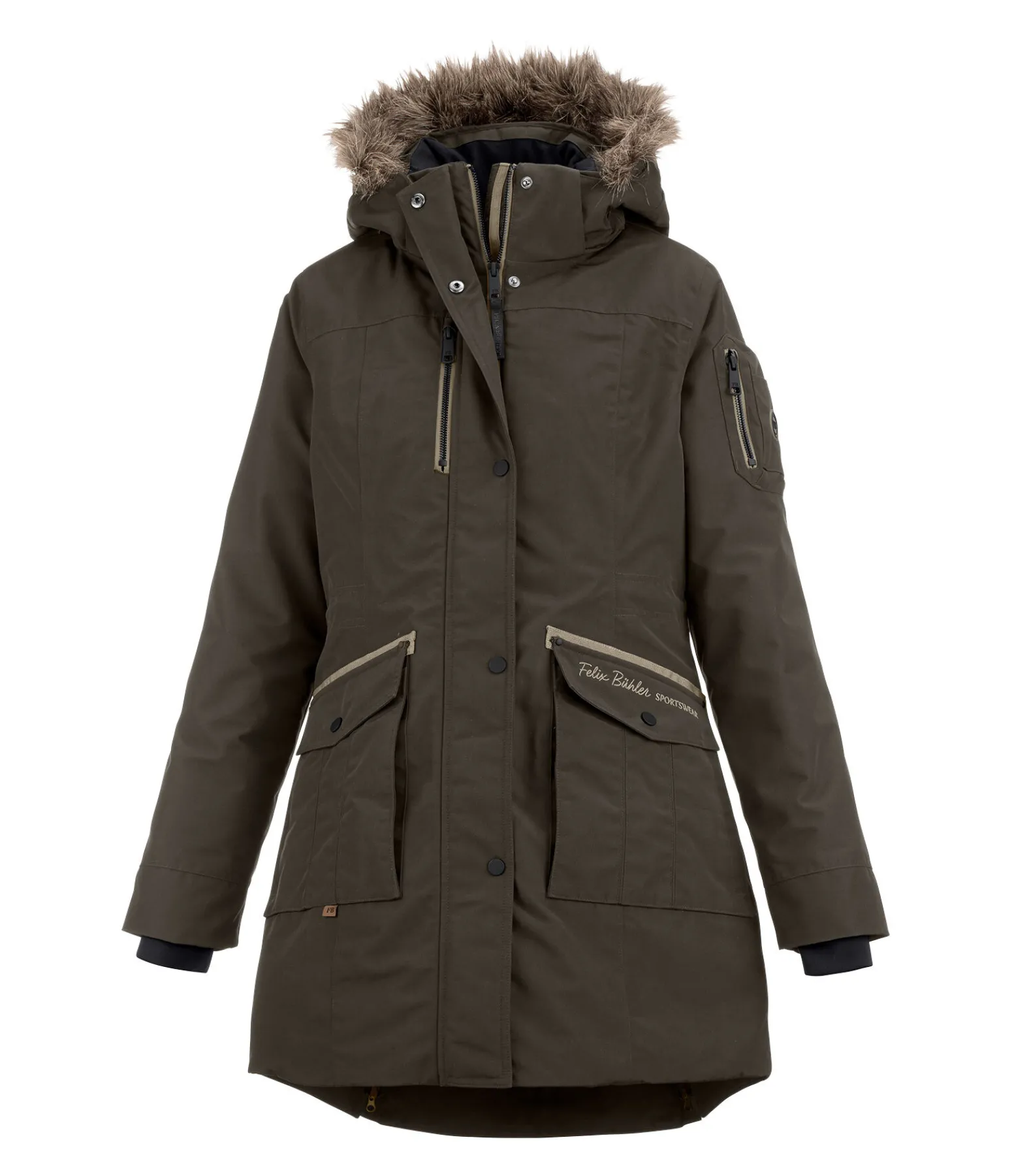 Parka d’équitation très chaude, solide et résistante aux intempéries. Capuche réglable et amovible par fermeture à glissière, pouvant être fixée dans le dos. Sa bordure en fausse « fourrure » est elle aussi amovible. Imperméable (10.000 mm), coupe-vent et respirante. Garnissage matelassé chaud en imitation duvet doux. 2 grandes poches à rabat avec poche latérale. 1 poche de poitrine zippée, 1 poche zippée sur la manche, 1 poche intérieure zippée, fermeture à glissière double sens dissimulée devant, 2 fentes cavalières zippées avec sous-patte à l’arrière, cordon de serrage à la taille, bas des manches avec finition bord-côte coupe-vent. Broderie et badge Felix Bühler. 100 % polyester.