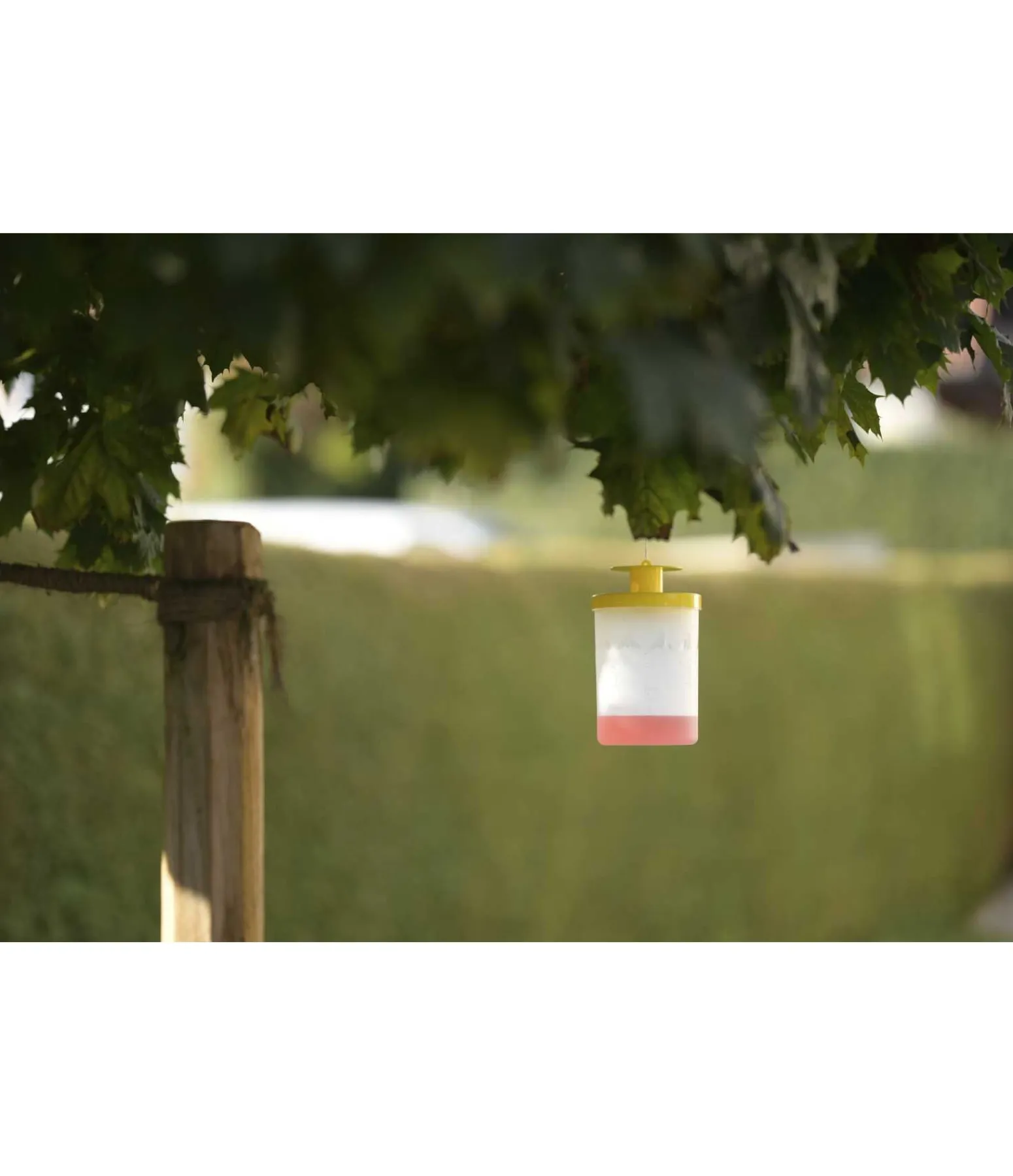 Piège à mouches avec attractif naturel. Agit sur une surface jusqu’à 100 m². Efficace pendant 3 à 6 semaines en fonction des conditions météorologiques. Le contenu peut être facilement éliminé avec les déchets organiques. Piège à mouches simple, efficace et réutilisable avec nouvel attractif. (référence 432 478).