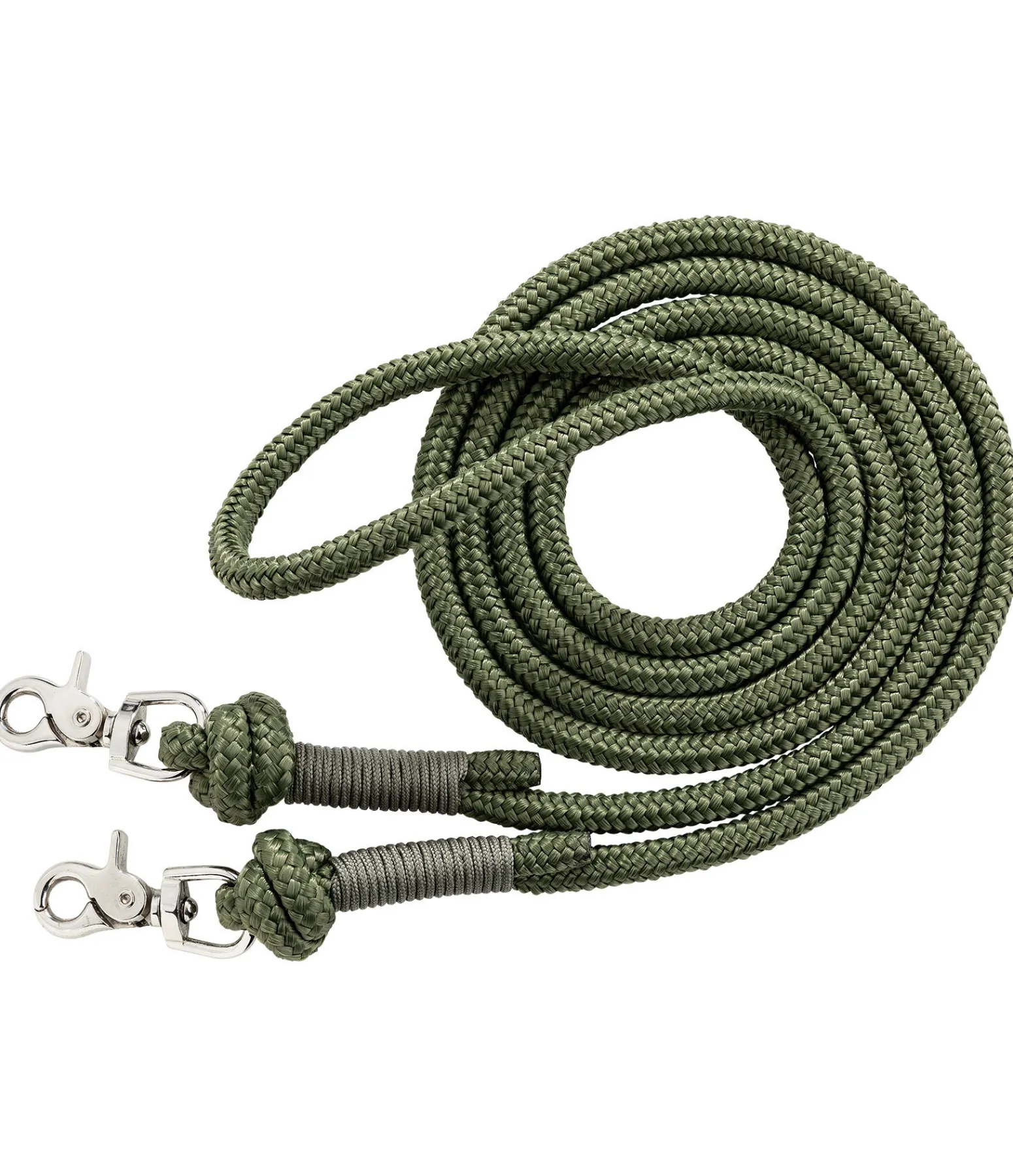 Rênes fermées particulièrement légères pour une connexion précise avec la bouche du cheval. Épaisseur 1,2 cm. Longueur (bout à bout) : 3 m. 100 % polyester.