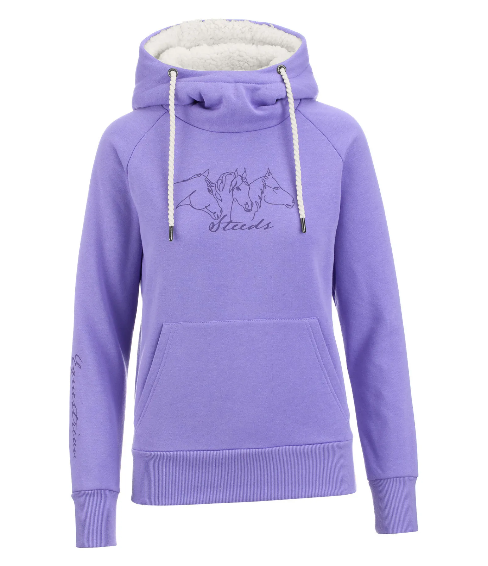 Sweat confortable avec capuche réglable doublée en polaire Teddy extra douce. Imprimé 3 têtes de cheval sur la poitrine. Imprimé «Equestrian» sur la manche. Poche kangourou. Bord-côte doux en bas des manches et à la taille. 65 % polyester, 35 % coton.