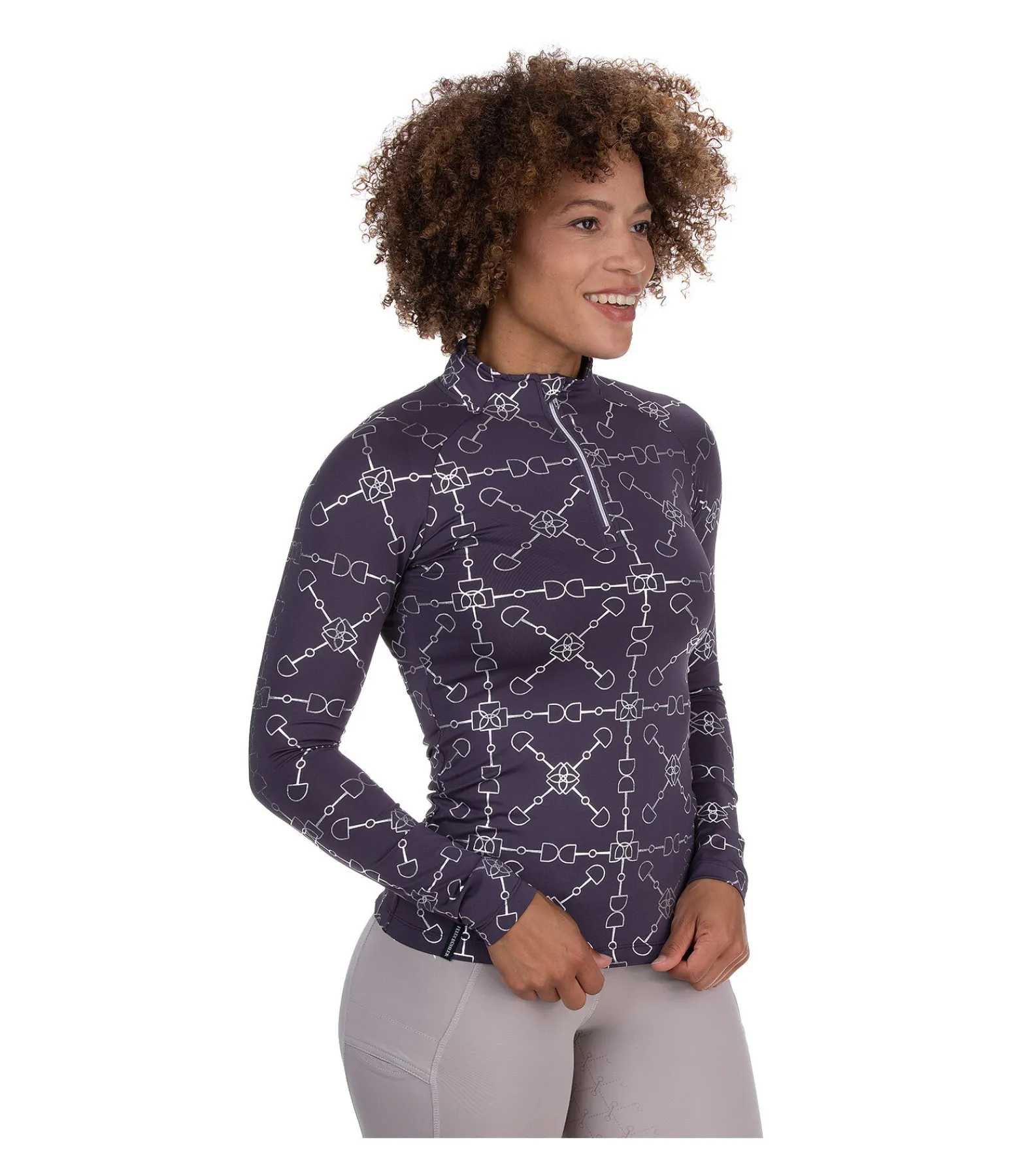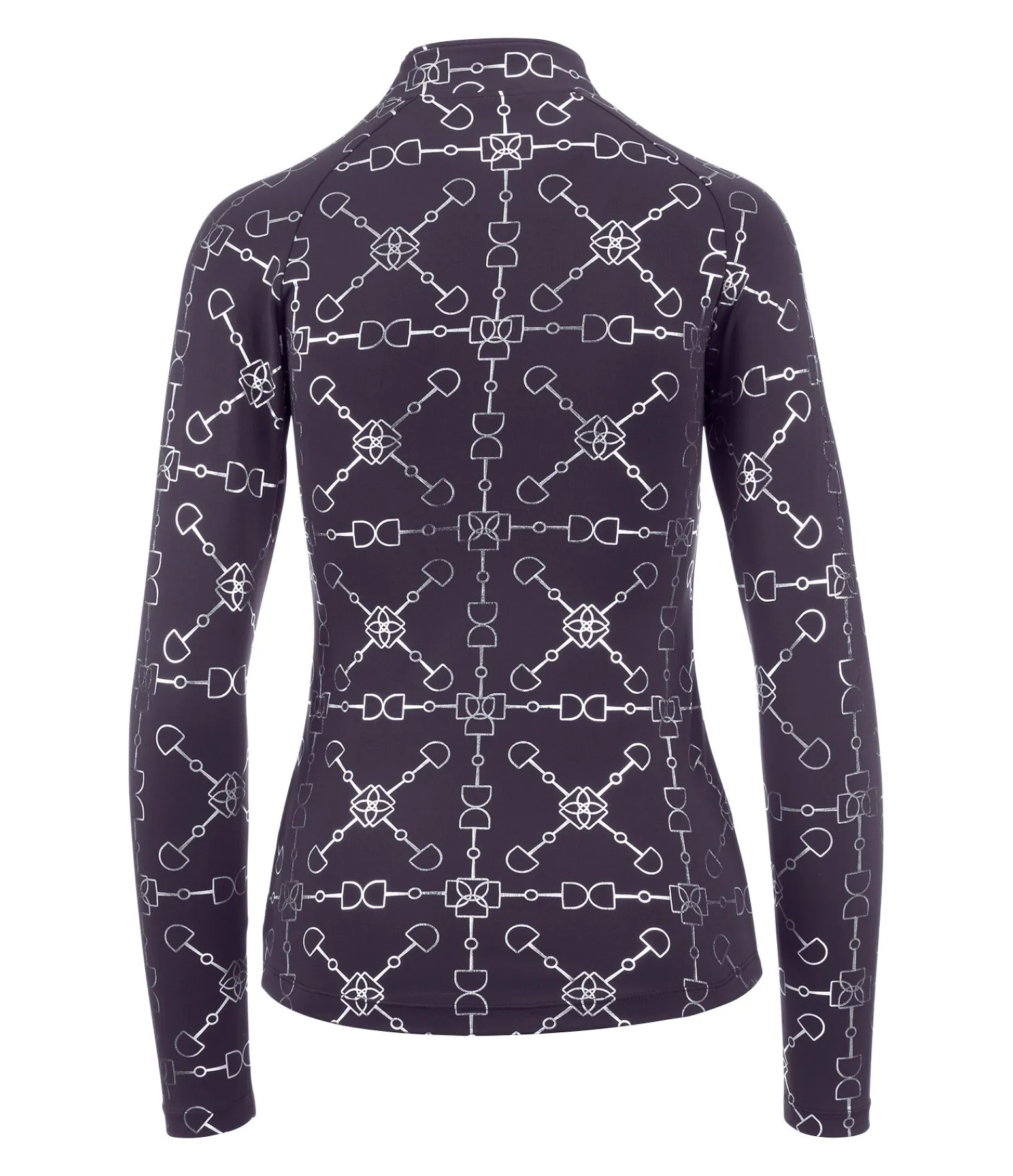 Élégant T-shirt à manches longues avec imprimé all-over brillant à motif mors. Respirant et à séchage rapide. Manches raglan. Col montant zippé avec protège-menton. 88 % polyester, 12 % élasthanne.