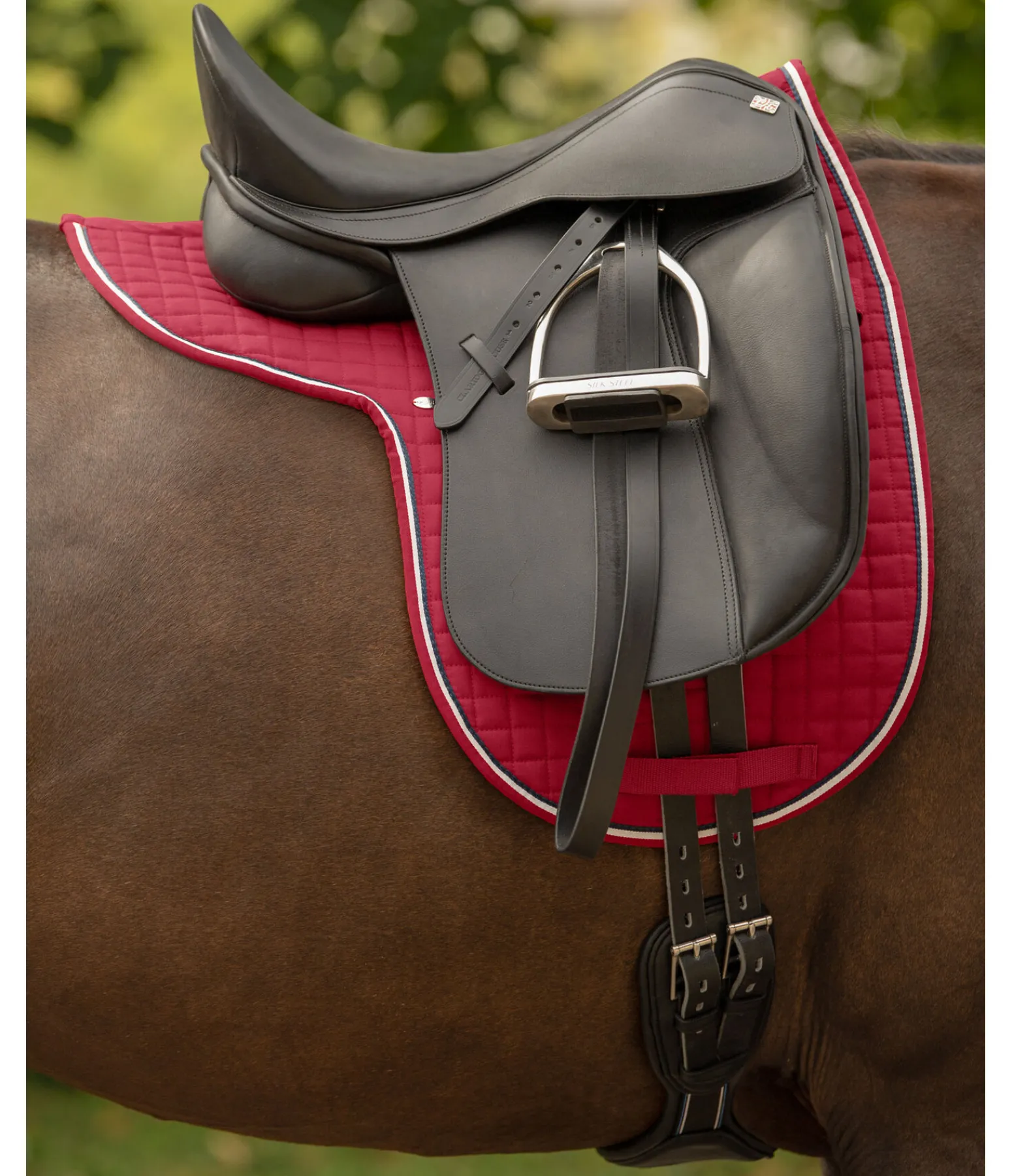 Tapis de selle classique et respirant, ce qui permet de moins couvrir la robe du cheval tout en assurant une protection optimale. Plaque métallique discrète avec logo gravé et bordure rayée de couleur contrastante. Passants de sangle et de contre-sanglons avec patte auto-agrippante. Dessous en Air Mesh respirant et absorbant l’humidité. Dessus 100 % coton, dessous et rembourrage 100 % polyester.