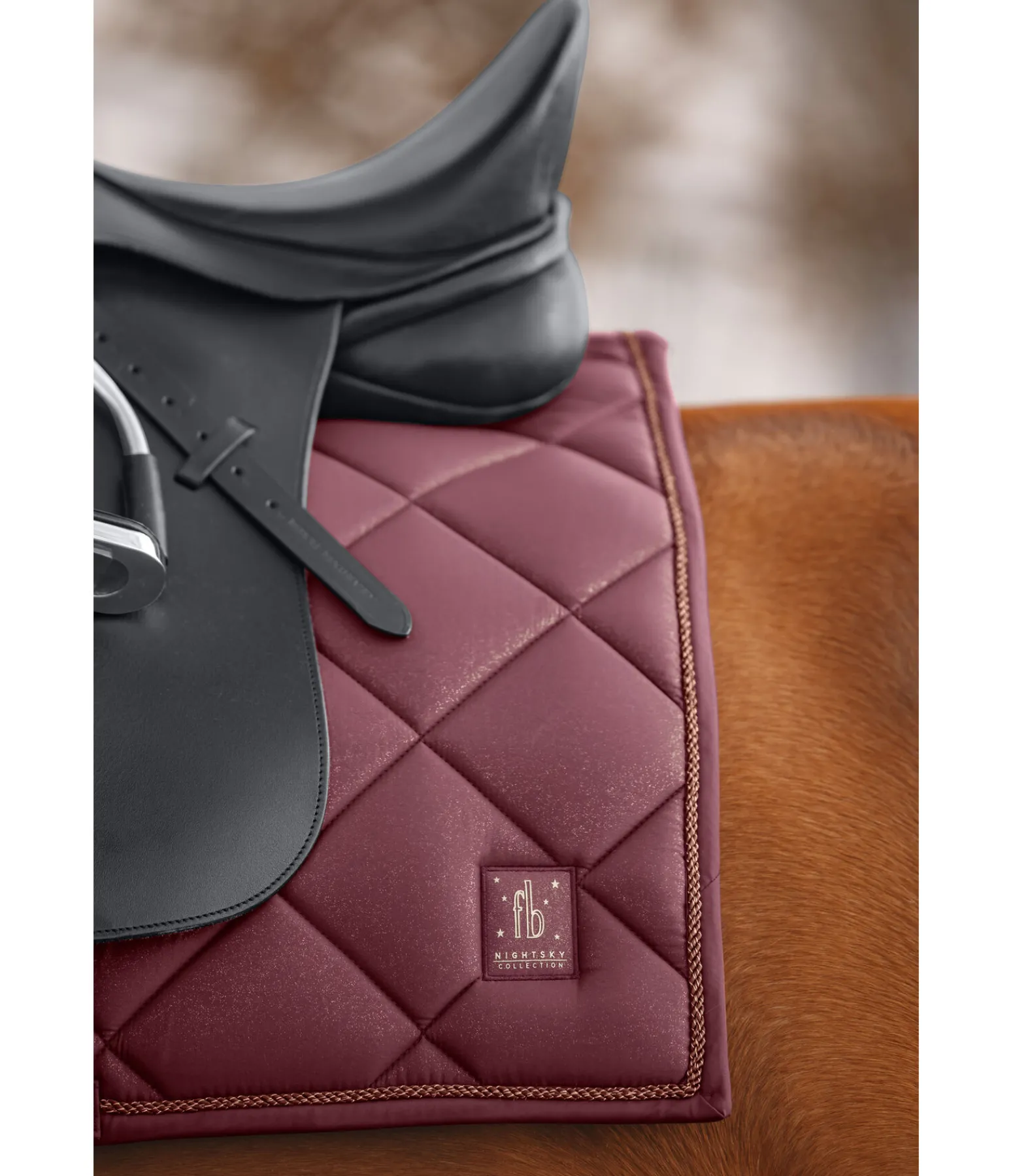 Élégant tapis de selle de forme carrée avec un soupçon de paillettes sur toute la matière supérieure et cordon décoratif scintillant. Logo de couleur assortie. Passants de contre-sanglons amovibles et passants de sangle avec pattes auto-agrippantes pratiques. Dessous en Air mesh respirant et absorbant l’humidité.