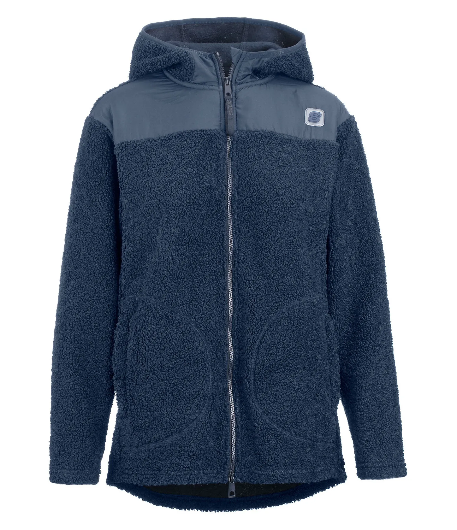 Veste en polaire Teddy douce avec capuche. Fermeture à glissière bidirectionnelle avec sous-patte et protège-menton. 2 poches avant zippées et dissimulées. Insert en tissu satiné. Badge STEEDS sur la poitrine. 100 % polyester.