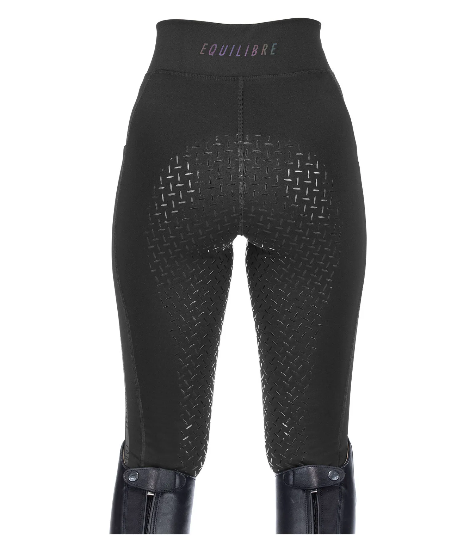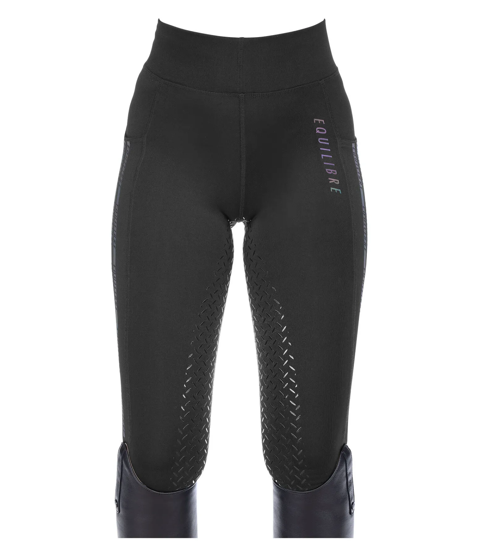 Legging d’équitation enfant sportswear. Matière respirante douce et extensible dans 4 directions. Fond intégral en silicone. 2 poches latérales pour téléphone portable. Bandes floquées avec reflets multicolores sur le côté. Logo marque avec reflts multicolores devant et à la ceinture arrière. 86 % polyester, 14 % élasthanne.