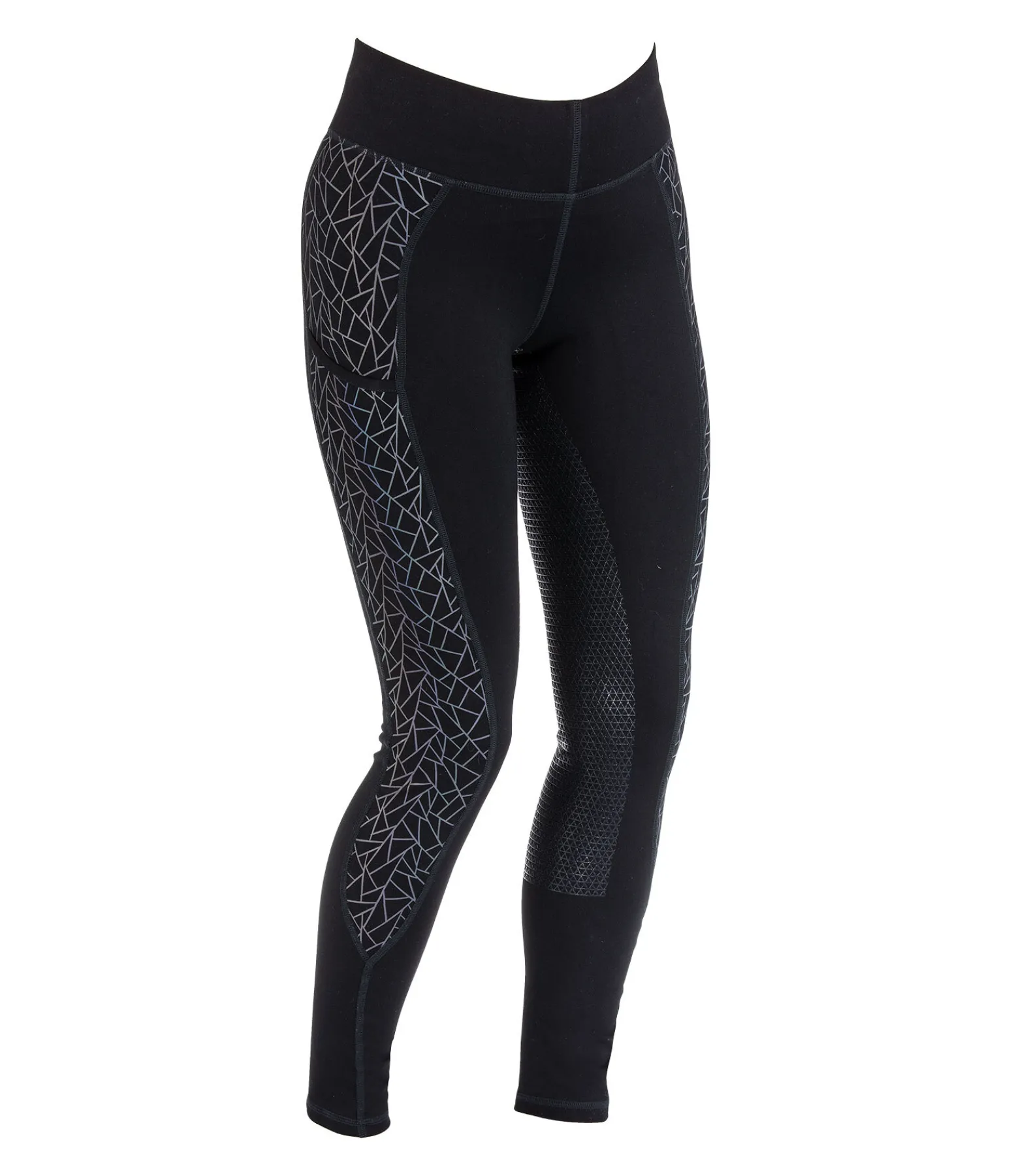 Legging d’équitation taille haute. Fond intégral grip. En matière élastique confortable et respirante. Imprimé géométrique holographique réfléchissant aux couleurs de l’arc-en-ciel à l’extérieur de la jambe. Poche latérale pour le téléphone portable sur la cuisse. Petite poche zippée à l’arrière du pantalon. Ceinture large pour un confort optimal. 68 % viscose, 28 % nylon, 4 % élasthanne.