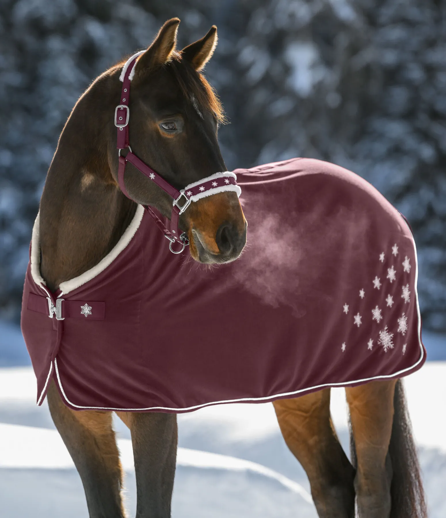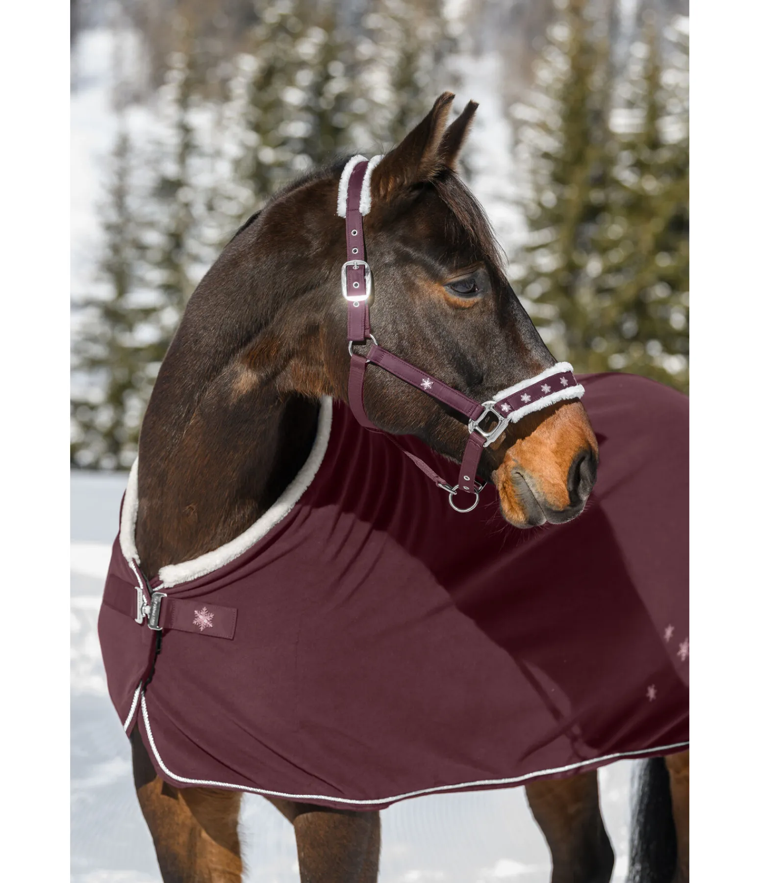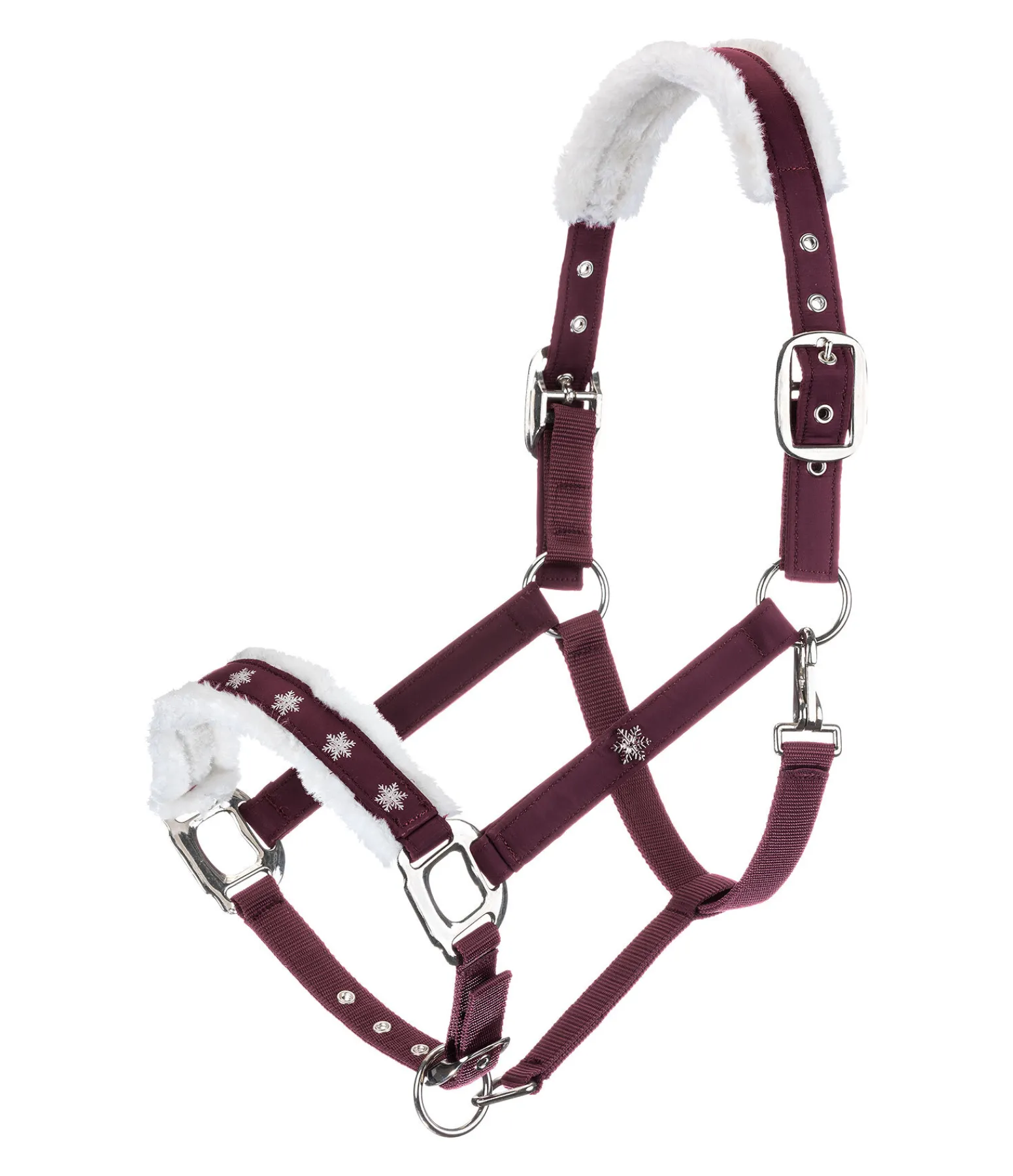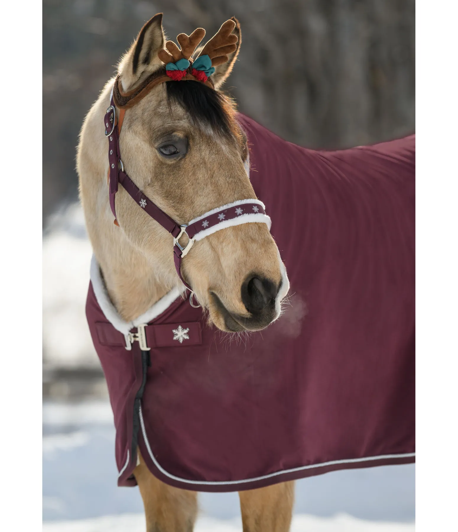Licol de Noël. Rembourrage en polaire Teddy sur la têtière et la muserolle. Flocons de neige brodés sur la muserolle et sur chaque montant.