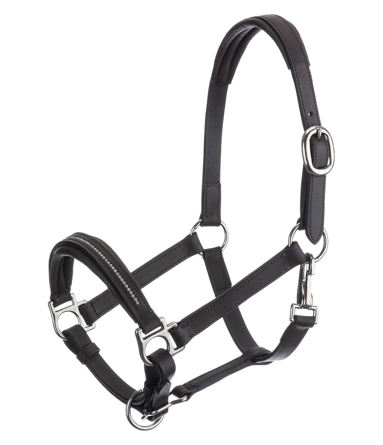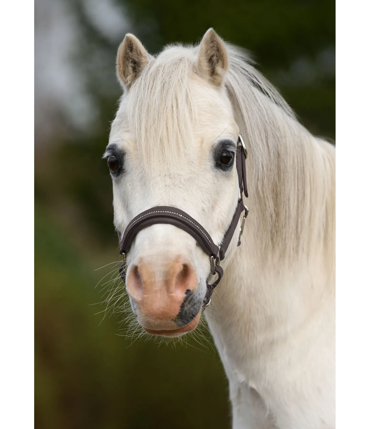 Licol poulain et shetland en cuir huilé, soigneusement décoré avec une rangée de petits strass sur la muserolle et un rembourrage en cuir véritable moelleux. Taille facile à régler.