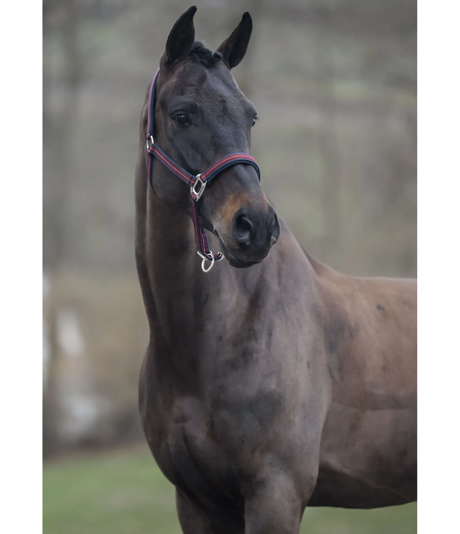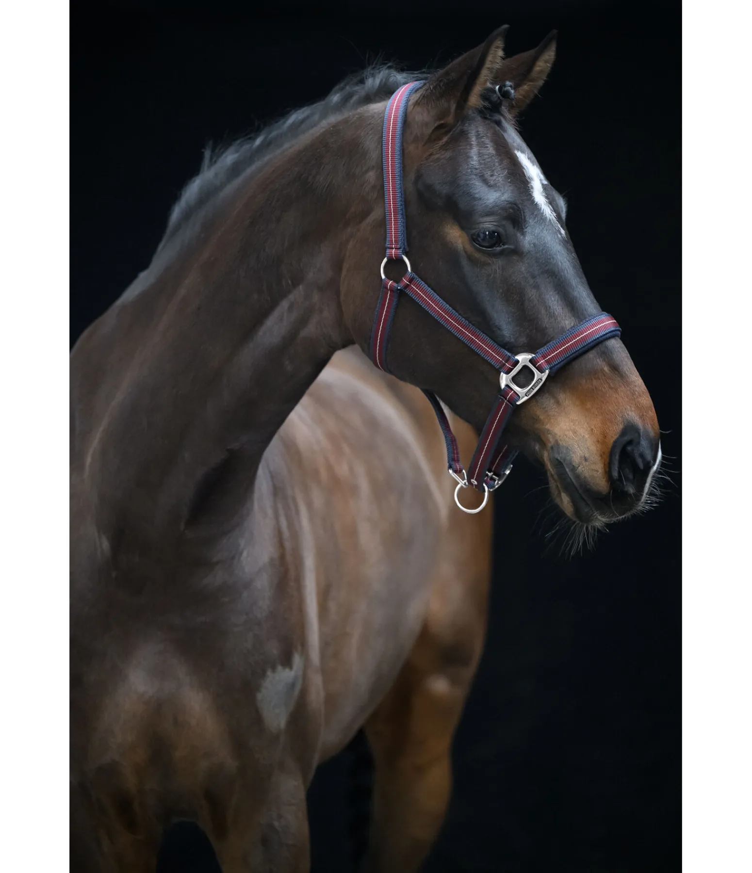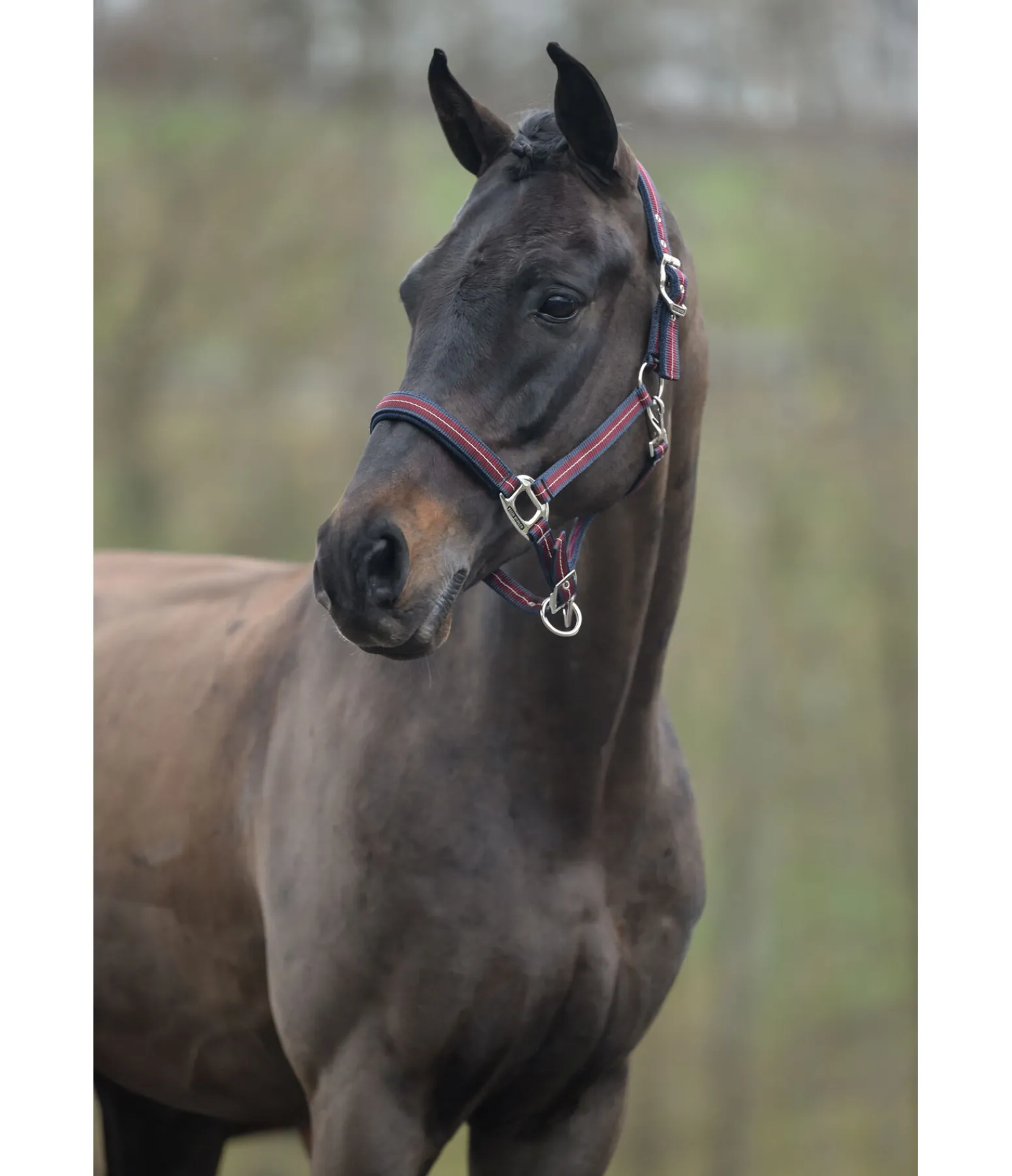 Licol rayé dans un look sportif avec doublure respirante en mesh sur la têtière et la muserolle. Muserolle et têtière réglables. Licol 100 % polypropylène.