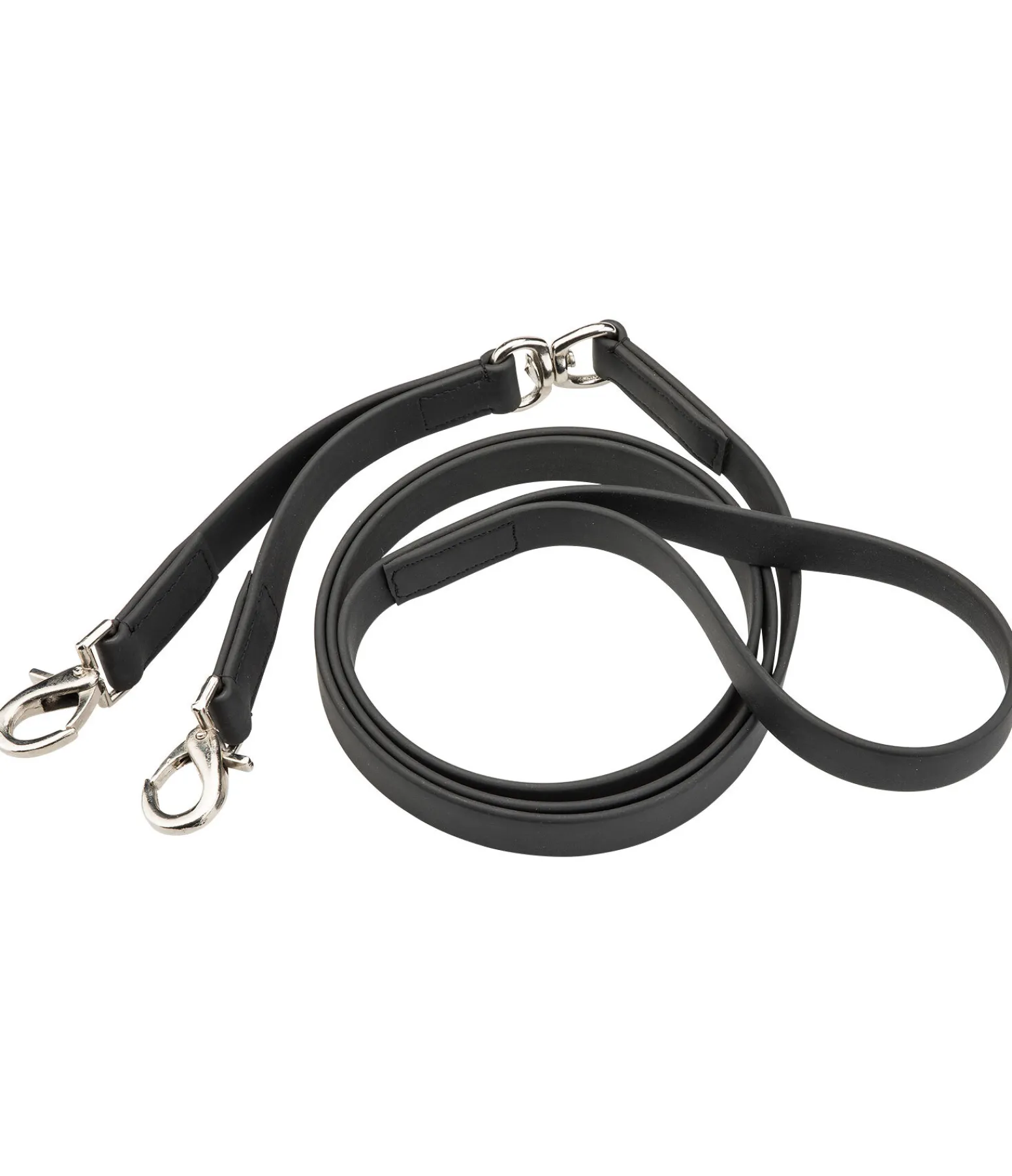 Longe en caoutchouc imperméable anti-salissures avec poignée. Les mousquetons à chaque extrémité permettent, une fois accrochés de chaque côté du licol ou du bridon, d’exercer une pression équilibrée sur le cheval. Bouclerie argentée. Longueur totale 2 m.
