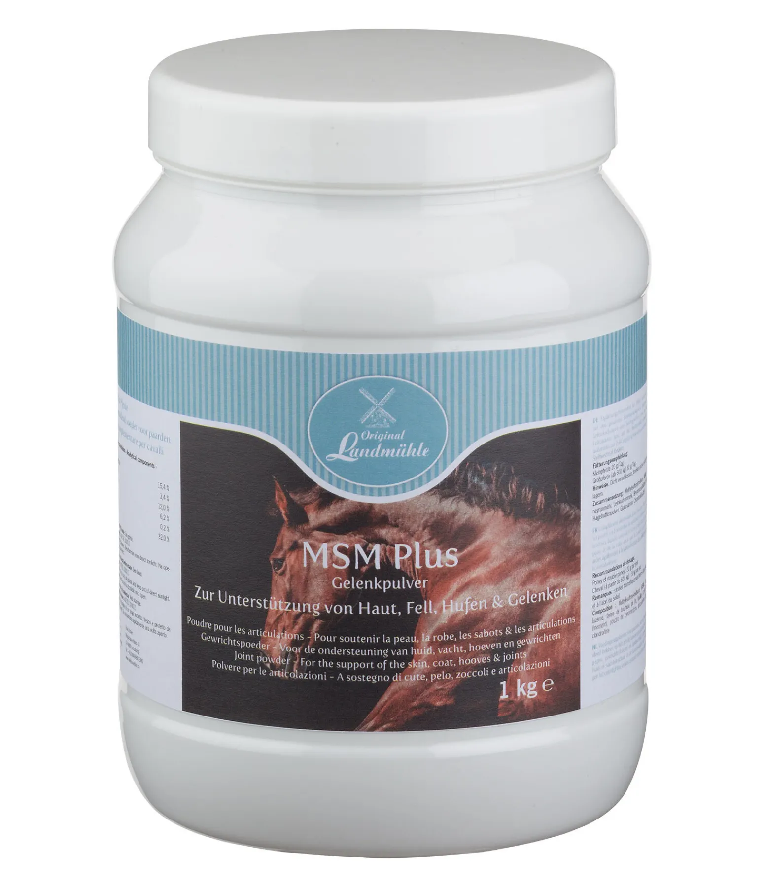 Aliment complémentaire pour chevaux sous forme de poudre à base de MSM, chondroïtine, glucosamine et vitamine C (cynorrhodons) pour soutenir le système immunitaire. Le MSM (méthyl-sulfonyl-méthane) est un composé soufré utilisé dans plus de 150 éléments constitutifs de l’organisme des chevaux. Le MSM apparaît initialement sous une forme différente dans l’océan, où il est transformé par les algues et finit par se frayer un chemin vers le pâturage de nos chevaux grâce aux précipitations. Lorsque le cheval pâture, son corps absorbe du MSM pendant le processus de digestion dans l’intestin grêle. Le MSM est la seule source significative de soufre pour l’organisme des chevaux, car le soufre pur ne peut pas être absorbé par les chevaux, étant filtré et éliminé par la peau et les reins. Le MSM est un constituant important de la kératine, ce qui en fait un composant important pour la robe et la corne. Il contribue ainsi à une structure saine de la peau et de la robe ainsi qu’à une croissance rapide des sabots avec une corne solide et de qualité. Il est lié à la chondroïtine dans le tissu conjonctif du cheval et est donc également un composant essentiel pour la régénération des cartilages et la fabrication de liquide synovial. Il peut ainsi améliorer la stabilité du tissu conjonctif. Le MSM participe à l’activation de la production de vitamine C et d’anticorps, il renforce ainsi activement le système immunitaire. Une autre tâche du MSM est de détoxifier l’organisme en l’aidant à éliminer les métaux lourds et d’éliminer les déchets des cellules. Ainsi, il soutient les fonctions hépatique et rénale. Il agit en tant qu’activateur et transporteur de substances vitales importantes telles que les vitamines, la glucosamine et la chondroïtine et contribue donc activement à un métabolisme articulaire sain, ce qui permet de prévenir l’usure prématurée ou de ralentir les processus dégénératifs dus par exemple aux maladies articulaires chroniques.