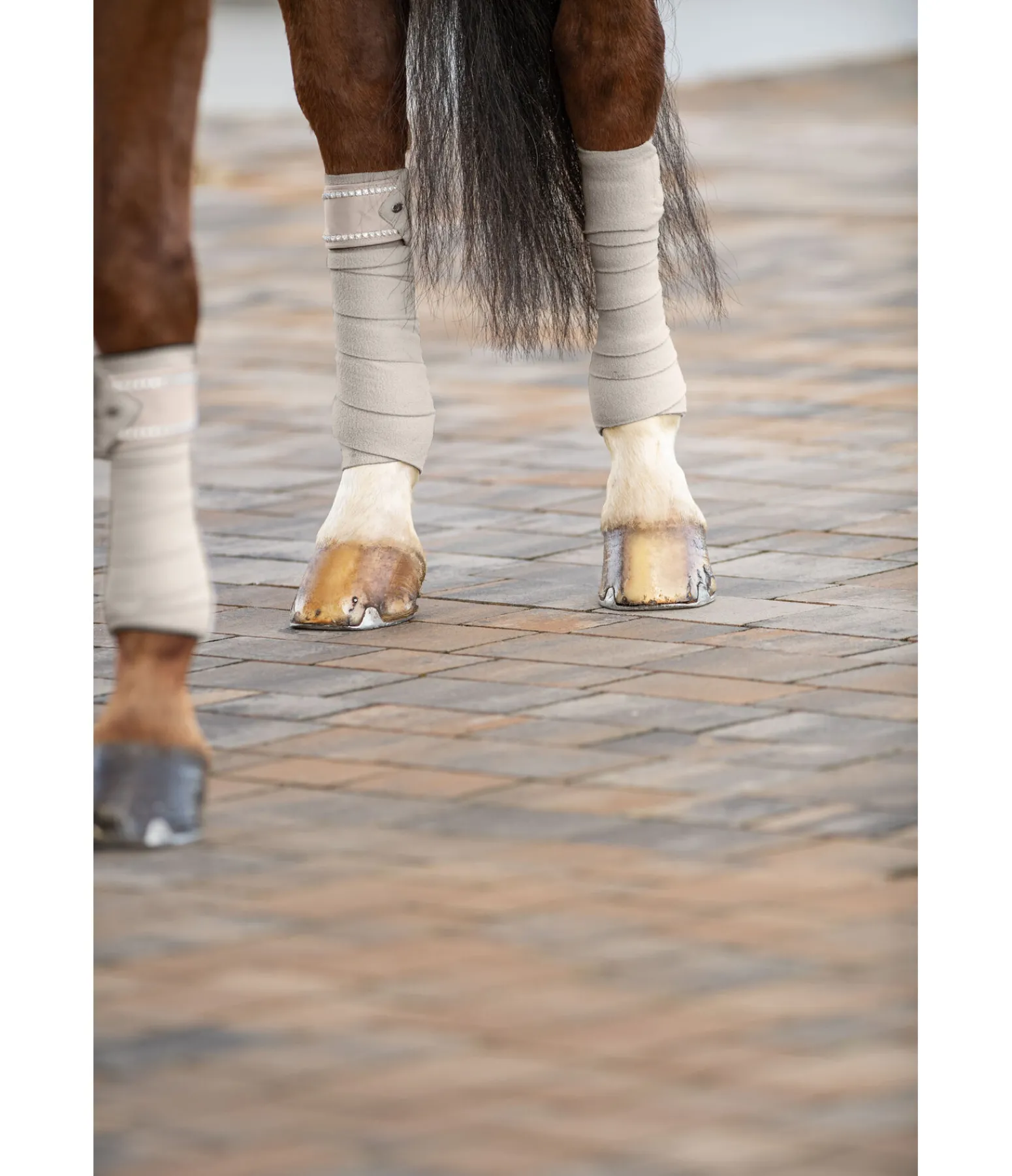Bandes de polo en polaire. Passepoil avec strass sur la fermeture des bandes. Patte auto-agrippante pour un maintien sûr. 100 % polyester. F (cheval) : 300 x 10 cm, P (poney) : 200 x 8 cm. Vendues par lot de 4.