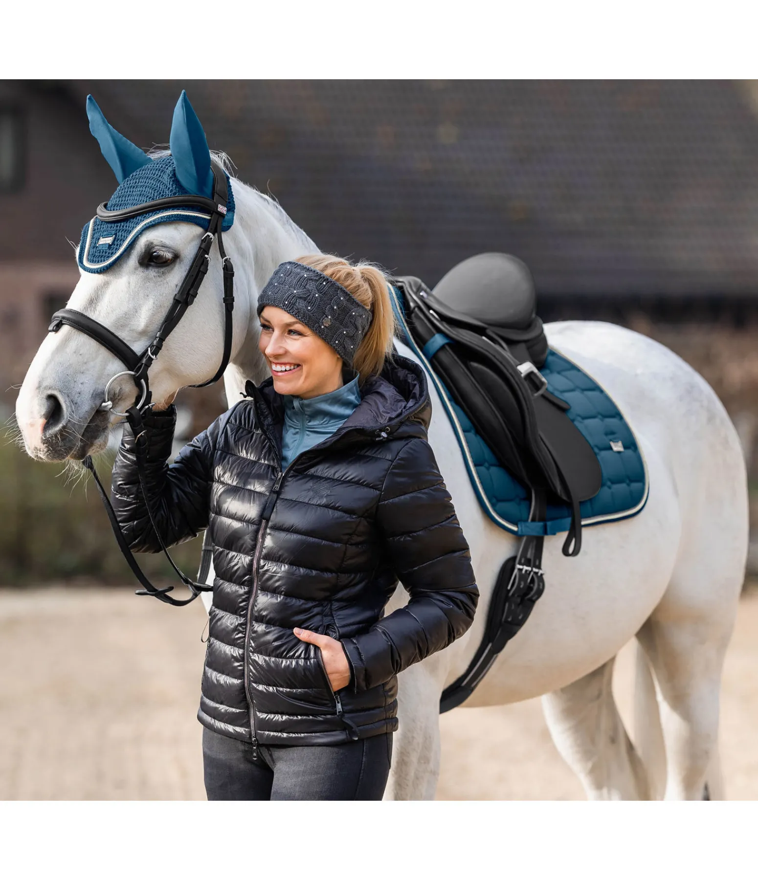 Bonnet anti-mouches à mailles larges avec double cordon décoratif subtil et brillant de couleur contrastante et petite plaque métallique centrée avec logo Felix Bühler. Matière extensible aux oreilles pour un confort optimal et pattes auto-agrippantes pour une fixation sûre au bridon. 97 % polyester, 3 % élasthanne.