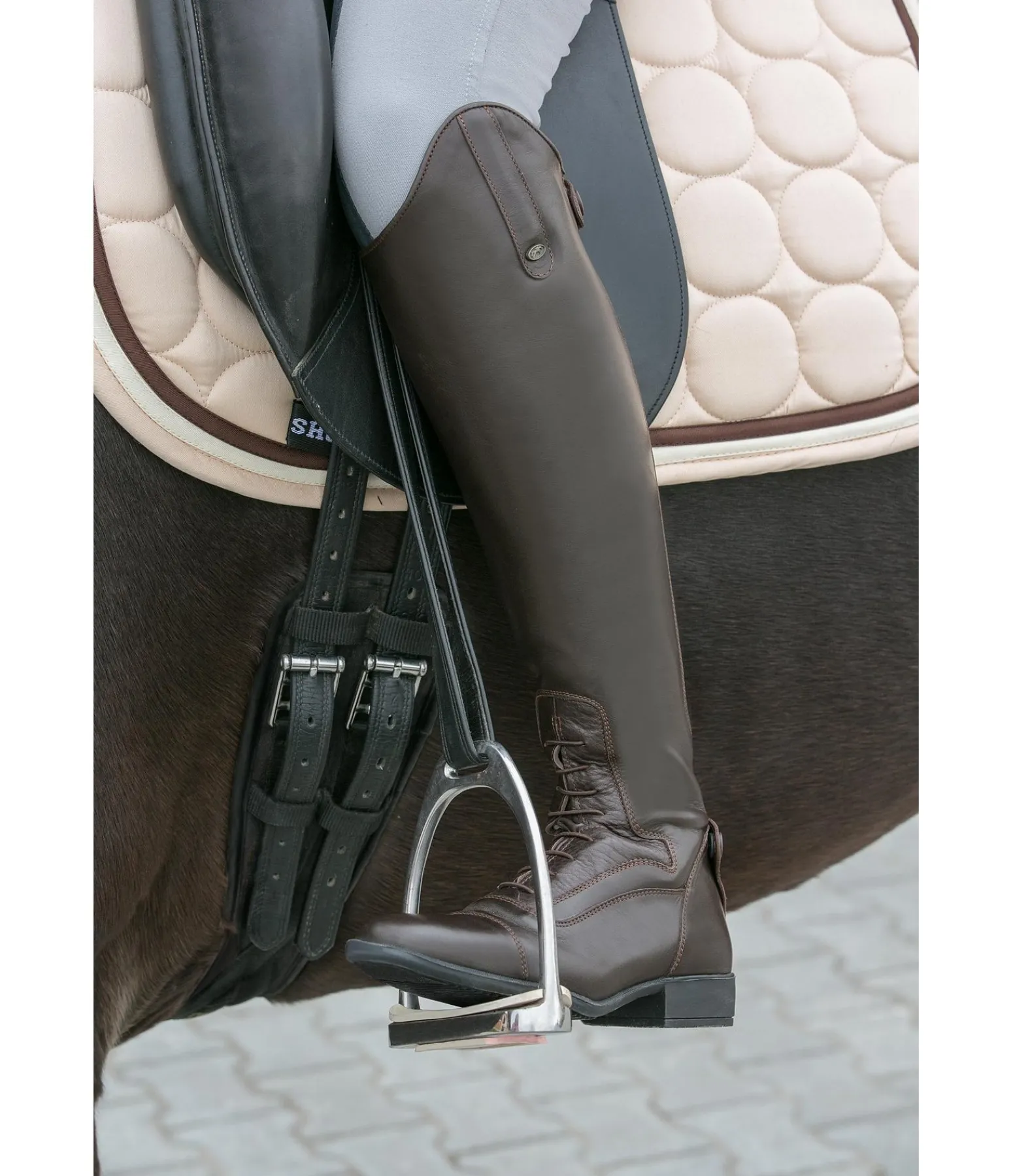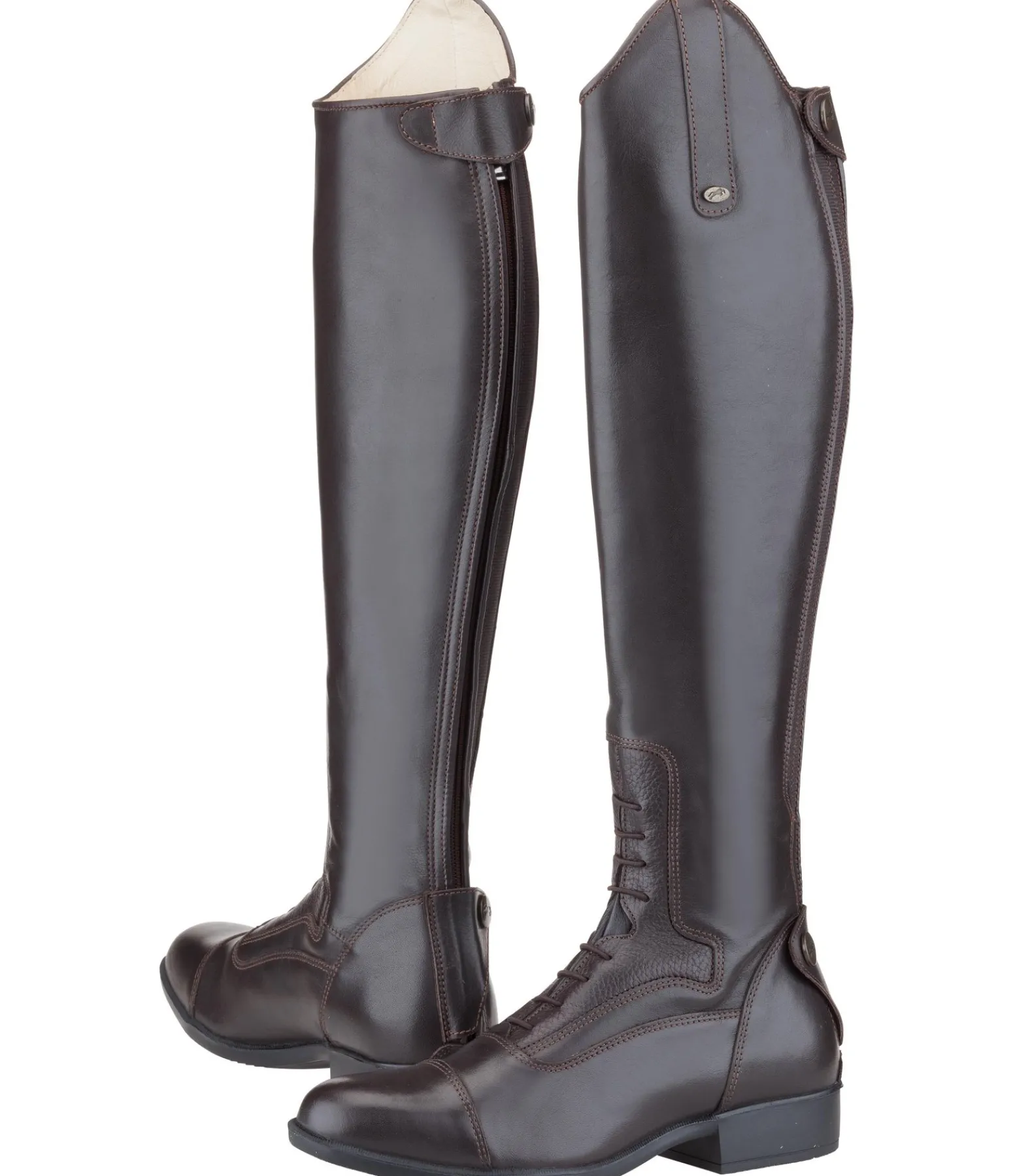 Bottes élégantes, à lacets, en cuir de vachette pleine fleur. Le cuir est souple tout en étant très robuste. Doublure en cuir de porc souple. Fermeture à glissière OPTI au dos. Empiècement élastique sur un côté pour une adaptation parfaite au mollet. Avec un cuir pleine fleur doux au niveau du laçage pour bien maintenir le talon en bas dans l’étrier. Pied de forme carrée élancé. Autres caractéristiques : voûte plantaire absorbant les chocs avec semelle intérieure amovible, semelle extérieure en caoutchouc résistant à l’usure et rabat au talon. Fabriquées en Portugal. Cuir italien.