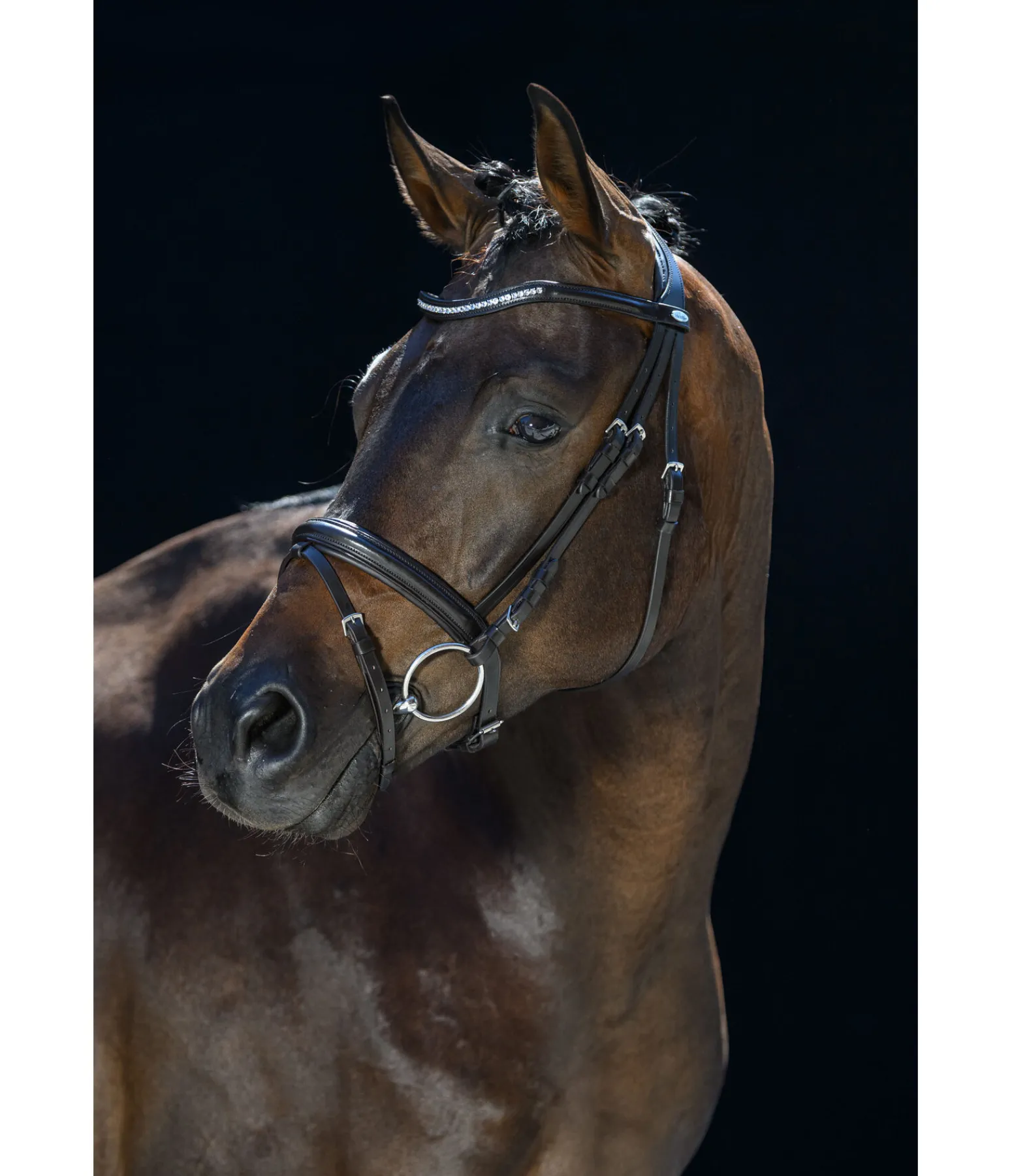Muserolle classique française combinée avec têtière extra souple de forme anatomique. Frontal vague orné de strass au centre. Jonc en cuir verni sur la muserolle. Sans rênes, sans mors. Cuir véritable. Bouclerie argentée.