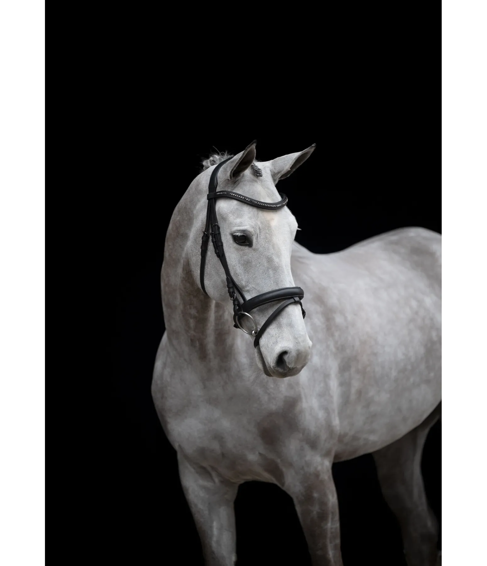 Bridon en cuir travaillé avec soin, ce qui le rend particulièrement souple et doux. Têtière anatomique. Frontal avec strass de couleur assortie. Frontal vague, têtière et muserolle avec doublure douce. Bouclerie gris foncé. Sans rênes sangle, sans mors.
