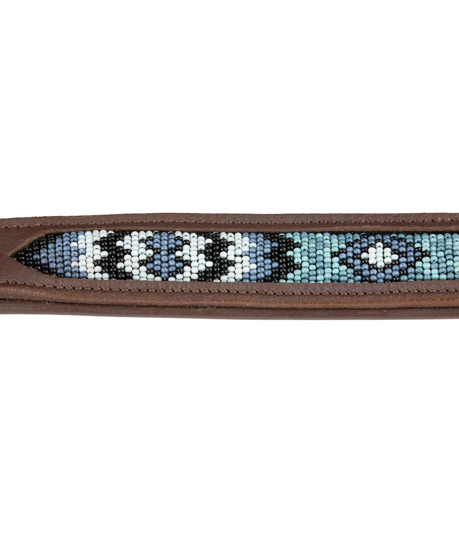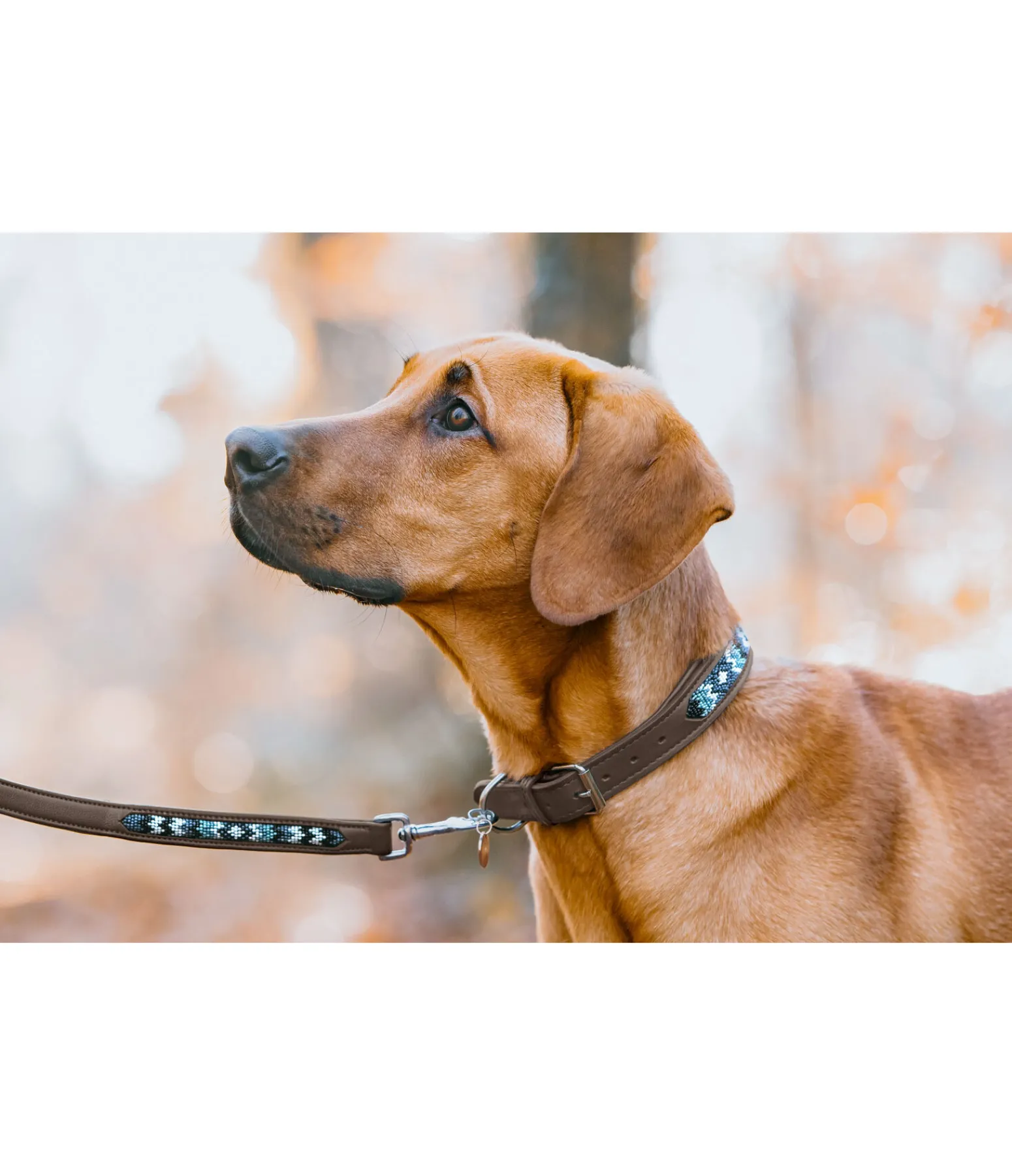 Collier en cuir véritable avec motifs aztèques en perles. Doublure douce pour un confort optimal. Facile à ajuster grâce à la boucle à ardillon. Joli petit médaillon et pendentif plume. Bouclerie argentée.