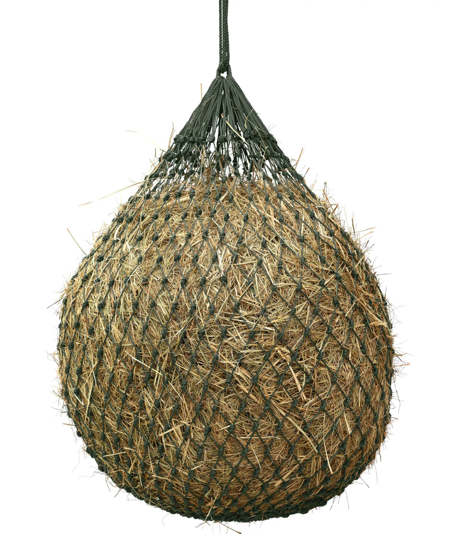 Un filet à foin confectionné dans une matière épaisse et de qualité. Anneau métallique centré dessous, sangles de serrage en haut. Dimensions des mailles : env. 4 x 4 cm. Dimensions à vide : 96,5 cm x 85 cm. Contenance : 5 kg.