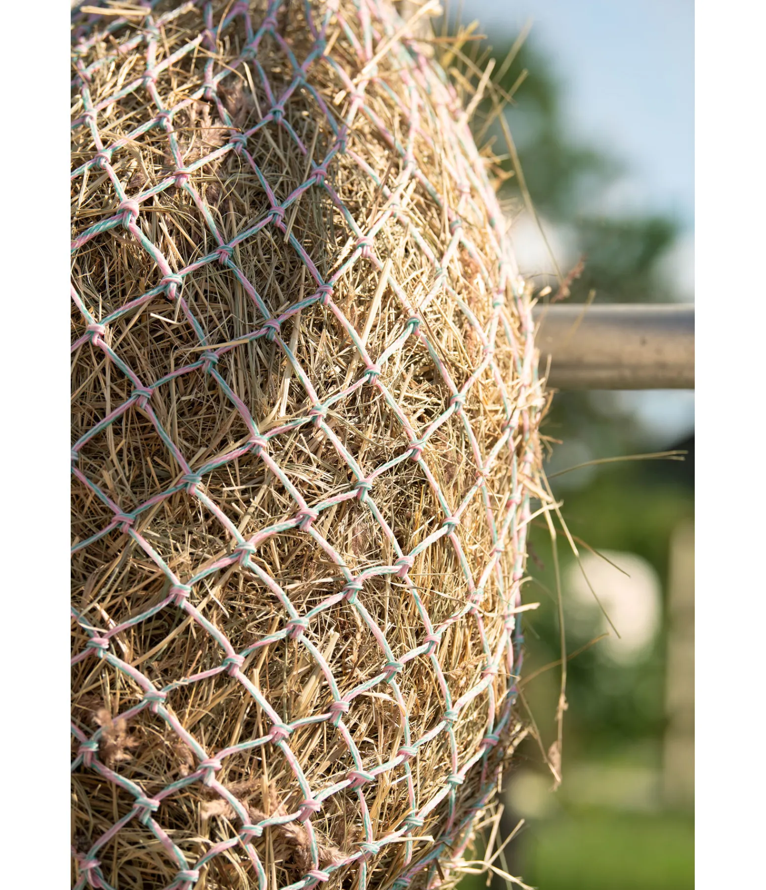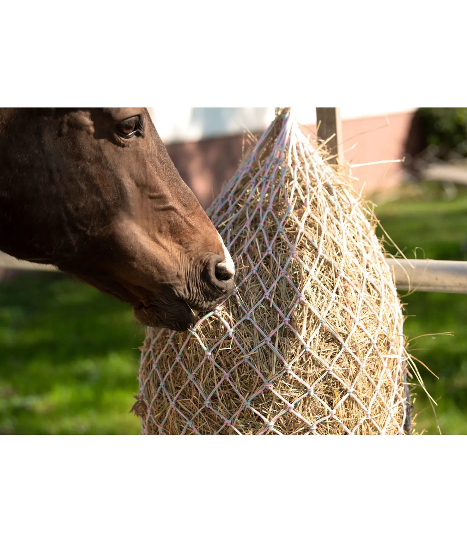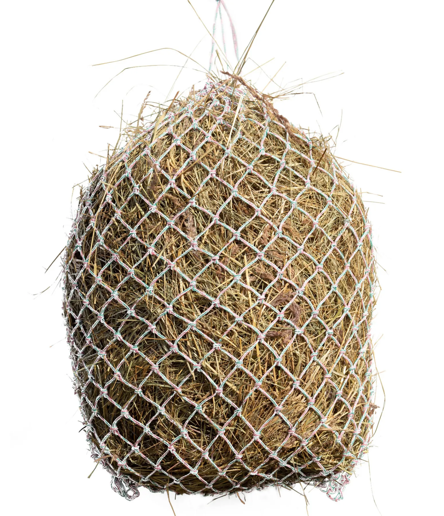 Filet à foin coloré en polypropylène solide. Mailles : 5 x 4,5 cm. Dimensions à vide : 85 x 80 cm. Contenance : 5 kg.