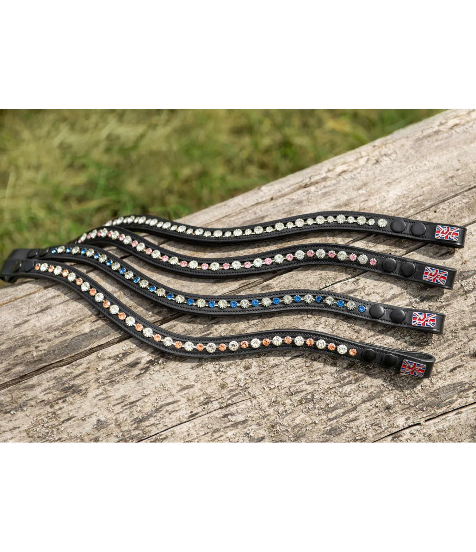Frontal vague en cuir véritable avec petits et gros strass. Facile à fixer grâce aux boutons-pression.