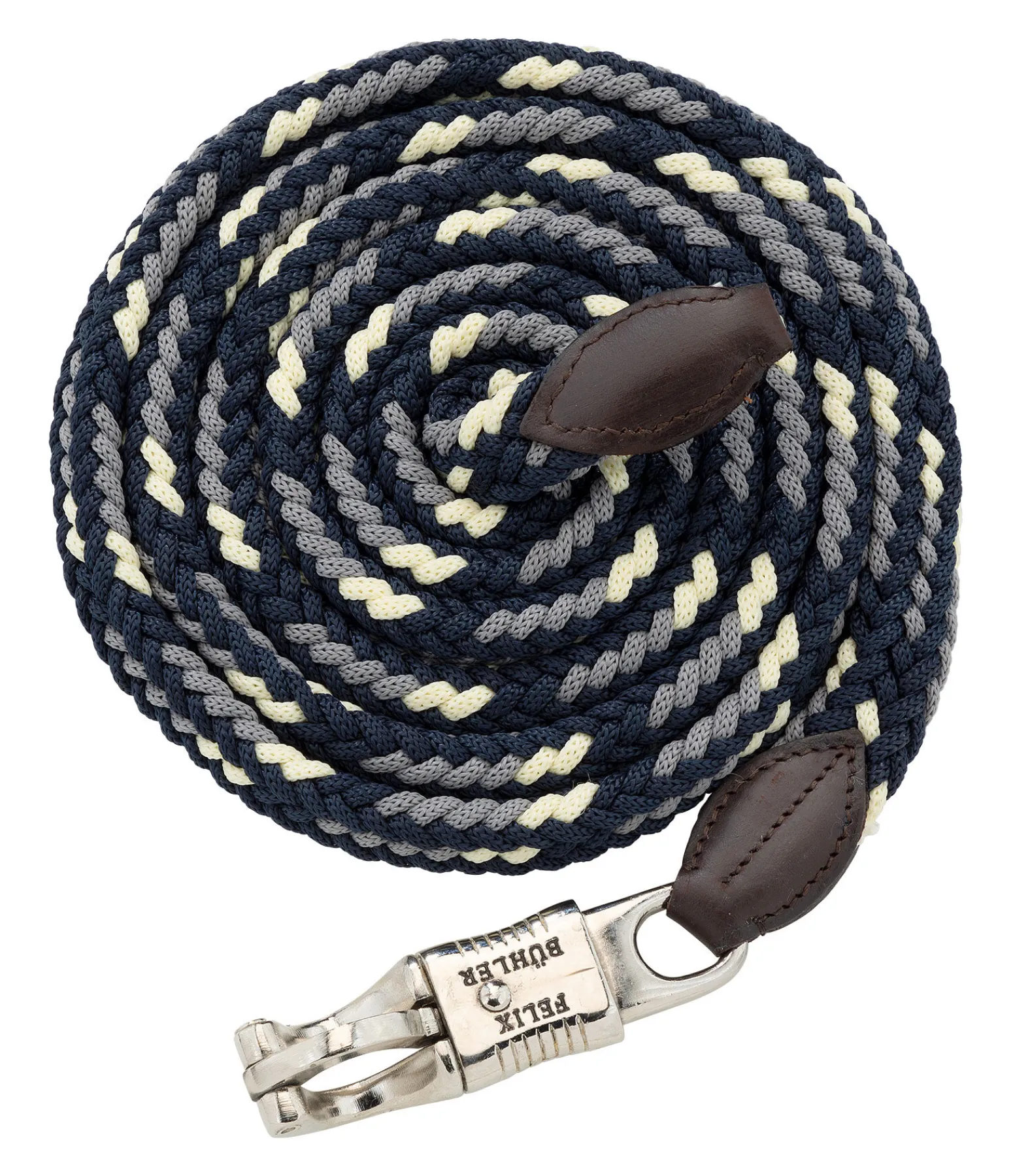 Longe tressée très résistante avec élégants embouts en cuir et mousqueton anti-panique. Assortie au licol 310040. Bouclerie argentée. 2 m. 100 % polypropylène.