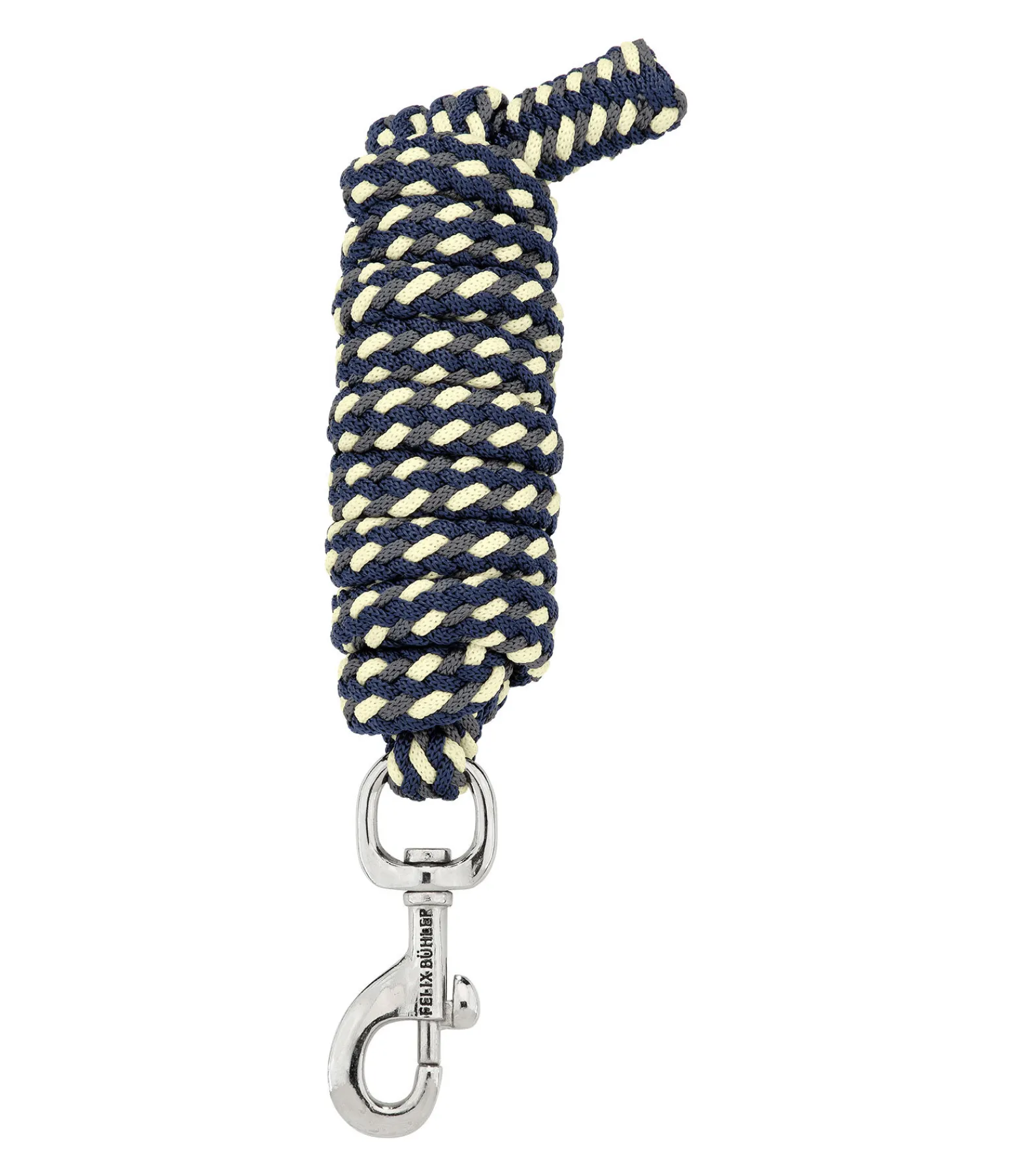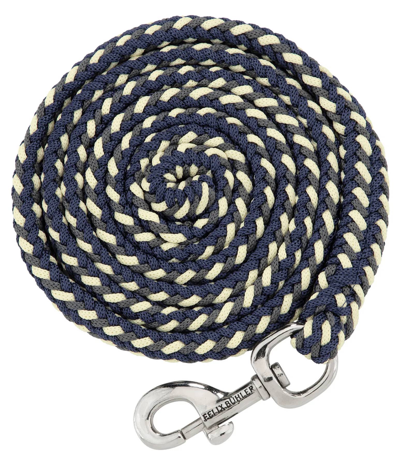 Longe tressée tricolore solide avec mousqueton. 2 m. 100 % polyester. Assortie au licol 310056.