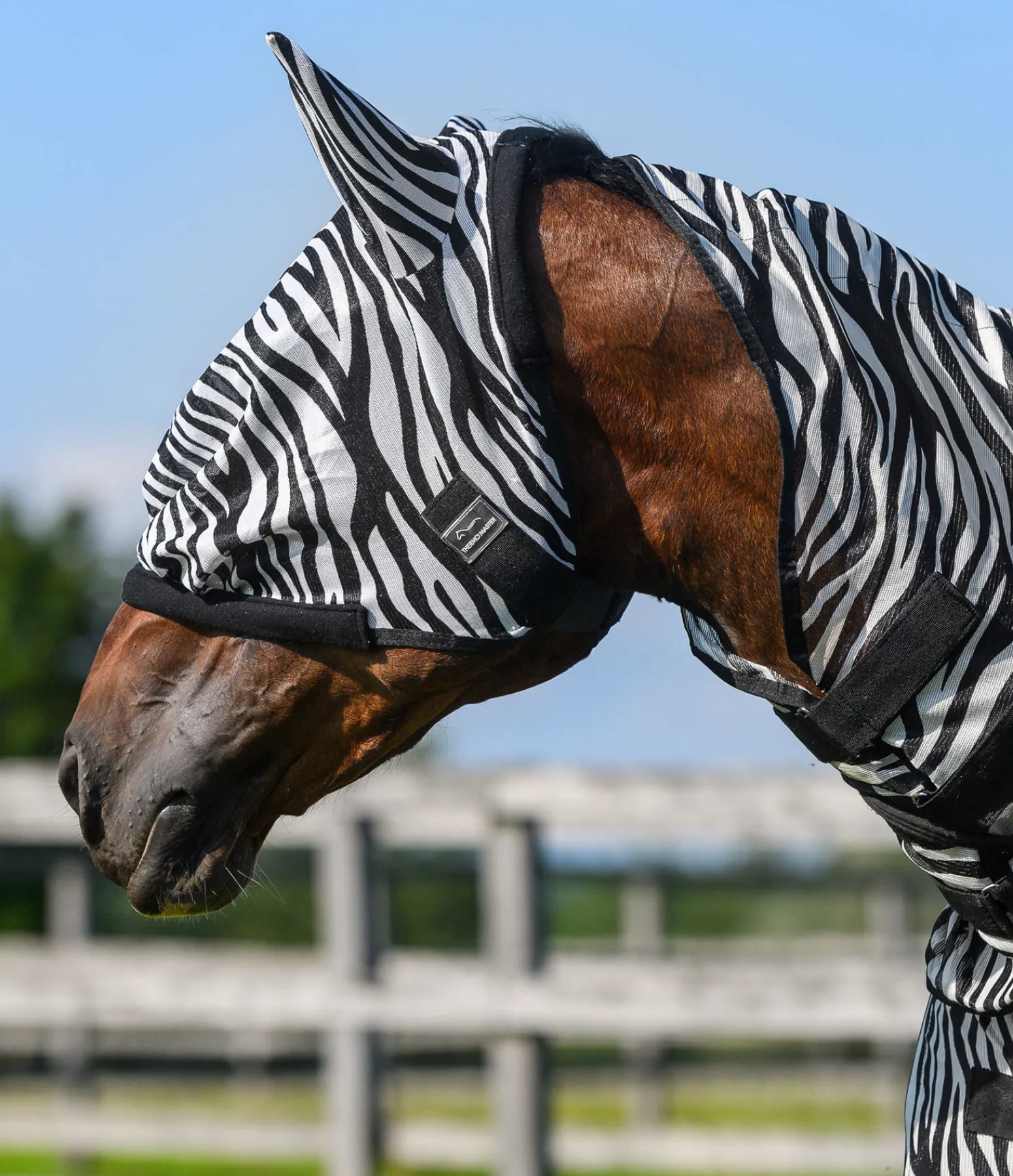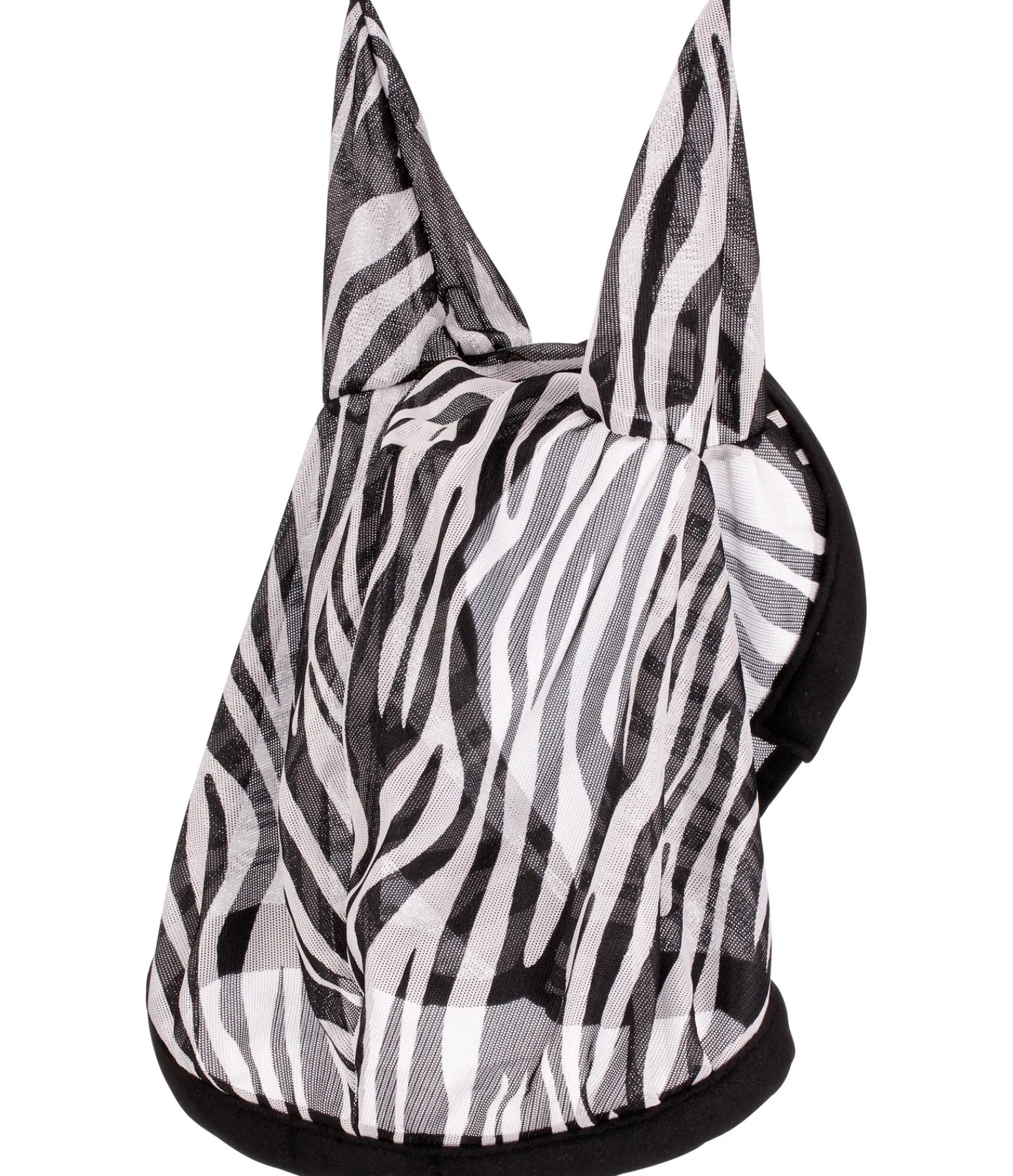 Léger masque anti-mouches à mailles serrées avec imprimé zèbre. Éloigne les insectes de la tête du cheval. Avec bordure polaire extra-douce. 100 % polyester.