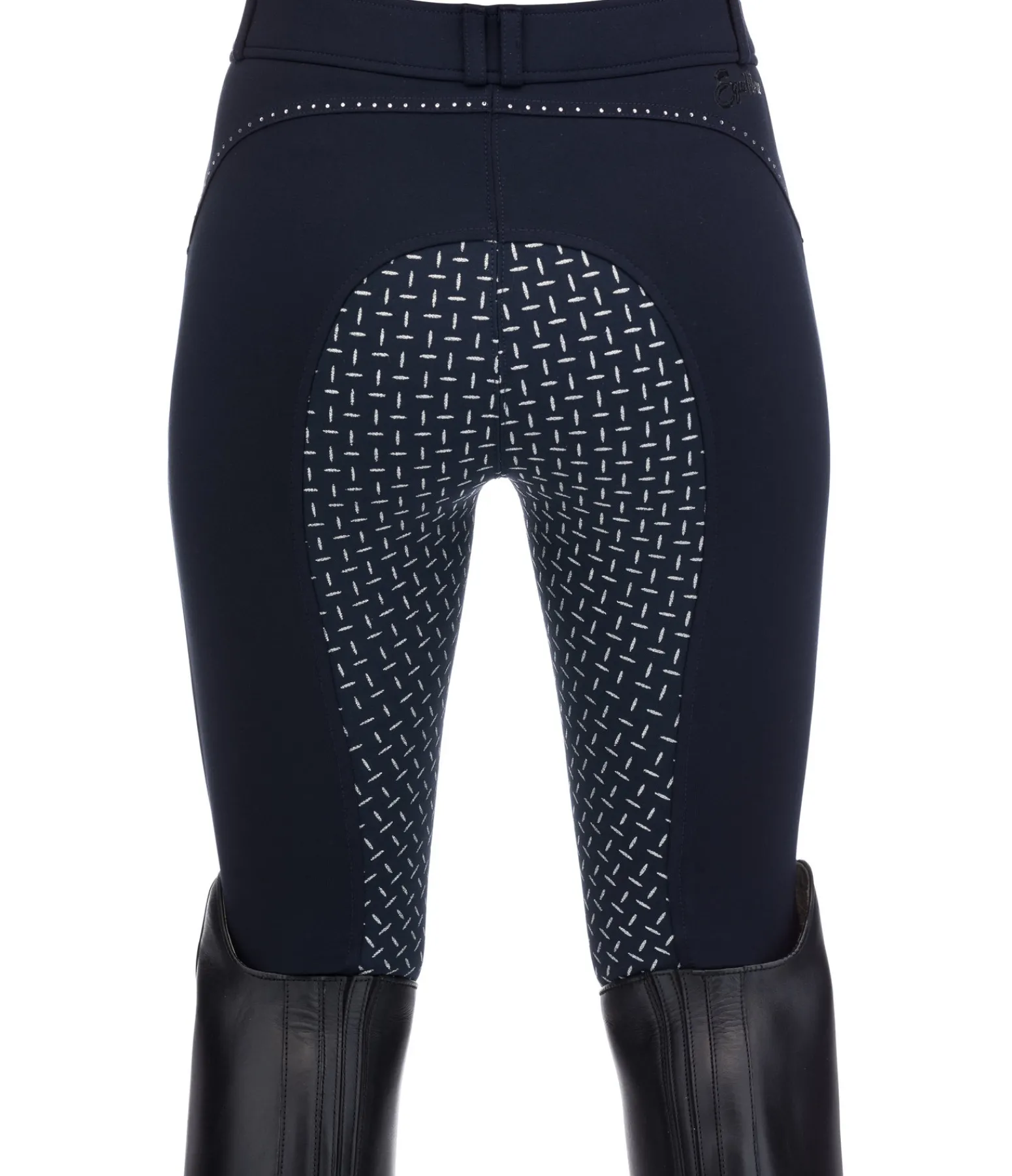 Pantalon d’équitation. Fond intégral grip en silicone scintillant. Matière stretch respirante, extensible dans 4 directions et ultra confortable. Strass sur les poches avant. Bas de jambe extensible sans patte auto-agrippante. 68 % viscose, 27 % polyamide, 5 % élasthanne.
