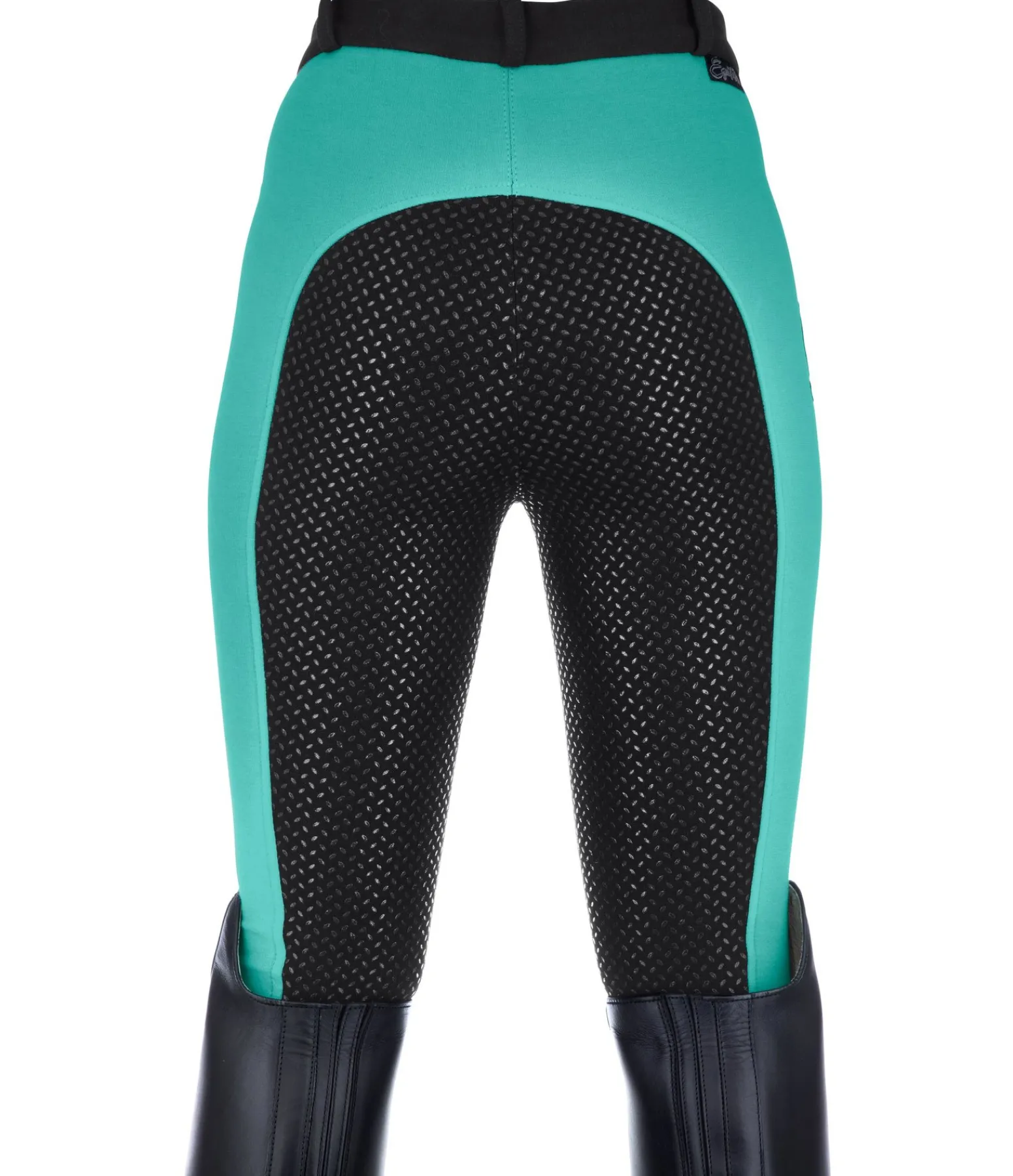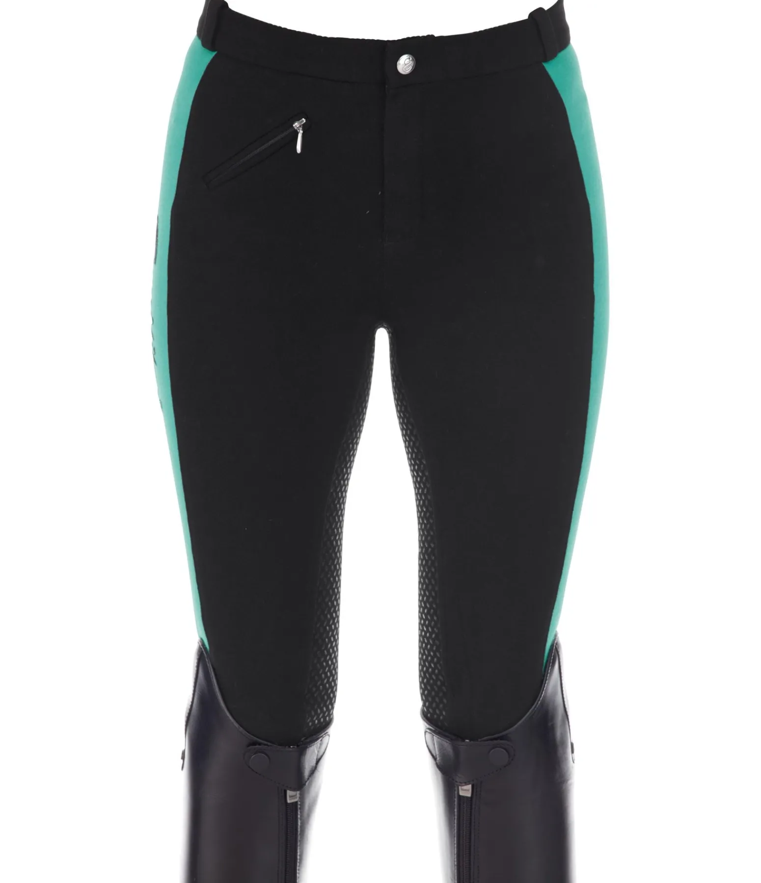 Pantalon d’équitation bicolore. Coton mélangé doux. Fond intégral en silicone idéal pour les cavaliers débutants. Ceinture élastiquée avec passants. Bas de jambe extensible sans patte auto-agrippante pour plus de confort. 1 poche avant zippée. Jolie broderie tendance sur la cuisse droite. 95 % coton, 5 % élasthanne.