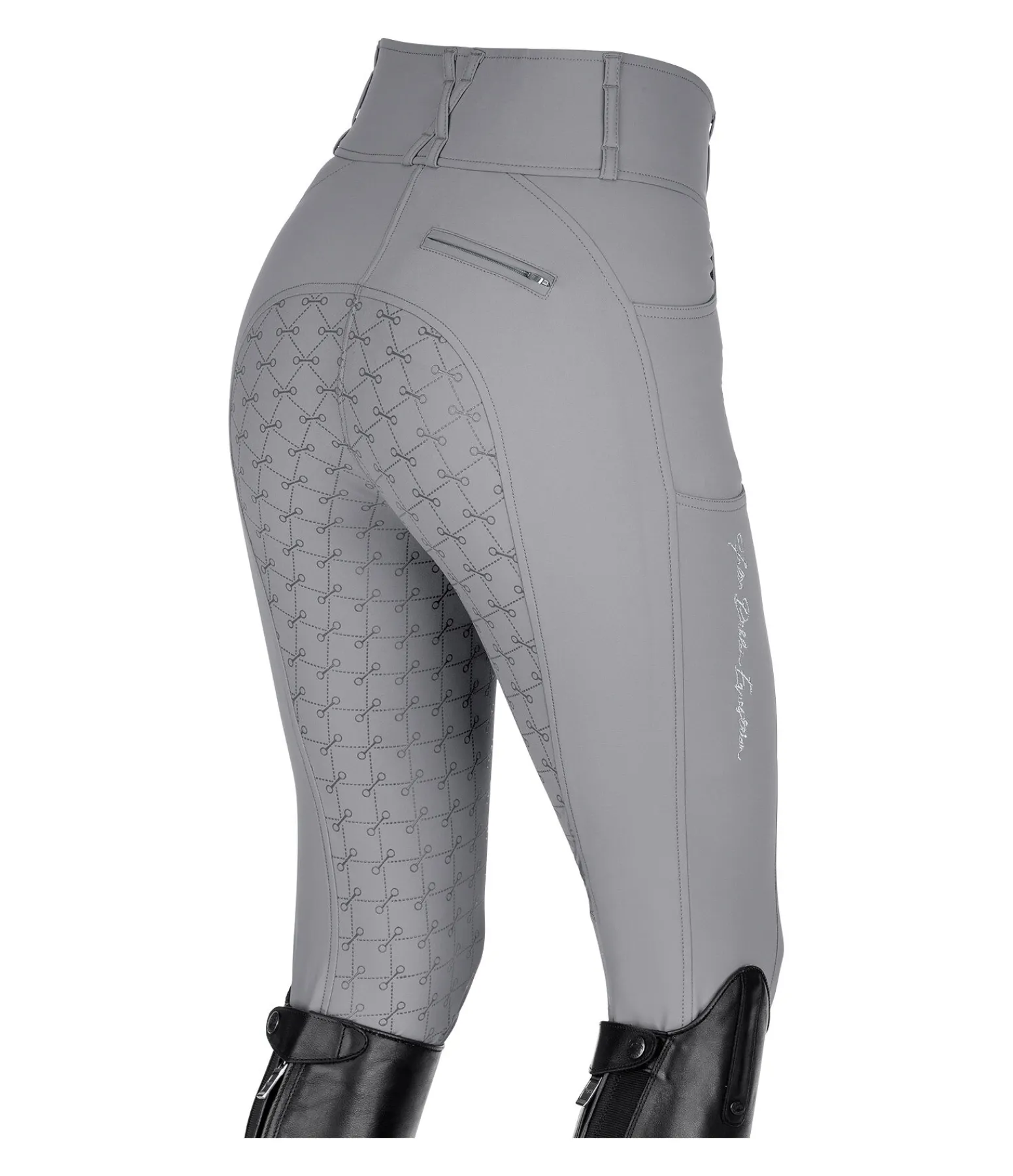Pantalon d’équitation sportswear et extensible, à fond intégral grip en silicone avec motifs de mors. Matière déperlante, respirante et à séchage rapide. Broderie Felix Bühler sur la jambe. Poche arrière zippée et poche pour téléphone portable sur la cuisse. Deux poches avant. Ceinture à passants extra large élastiquée avec 2 boutons. Aucune couture aux genoux. Bas de jambe extensible en stretch. 89 % nylon, 11 % élasthanne.