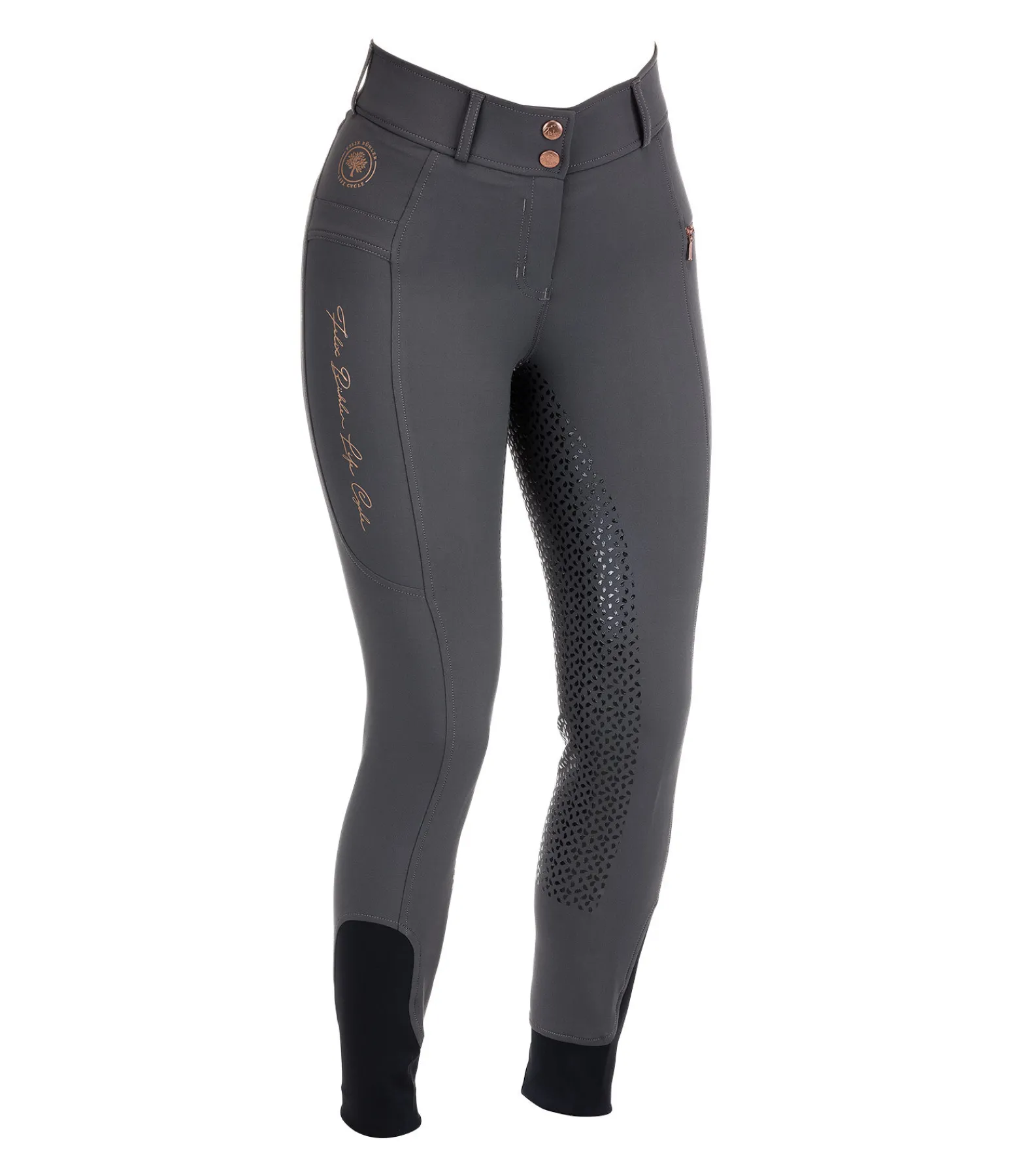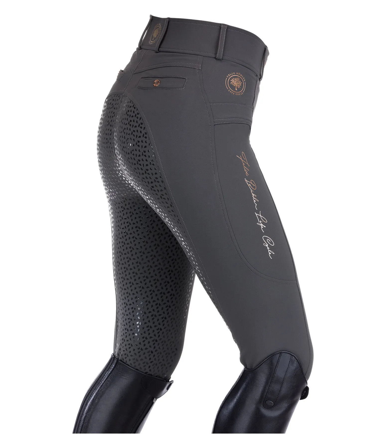 Durable et confortable ! Pantalon d’équitation à fond intégral grip en silicone extrêmement agréable à porter. Conçu principalement en stretch recyclé de grande qualité. Imprimés Felix Bühler Life Cycle. Matière respirante. Séchage rapide. 2 poches arrière et 2 poches latérales pour téléphone portable, dont une avec fermeture à glissière. Ceinture extra large avec 2 boutons. Aucune couture au niveau des genoux. Bas de jambe extensible en stretch. 89 % polyester, 11 % élasthanne.